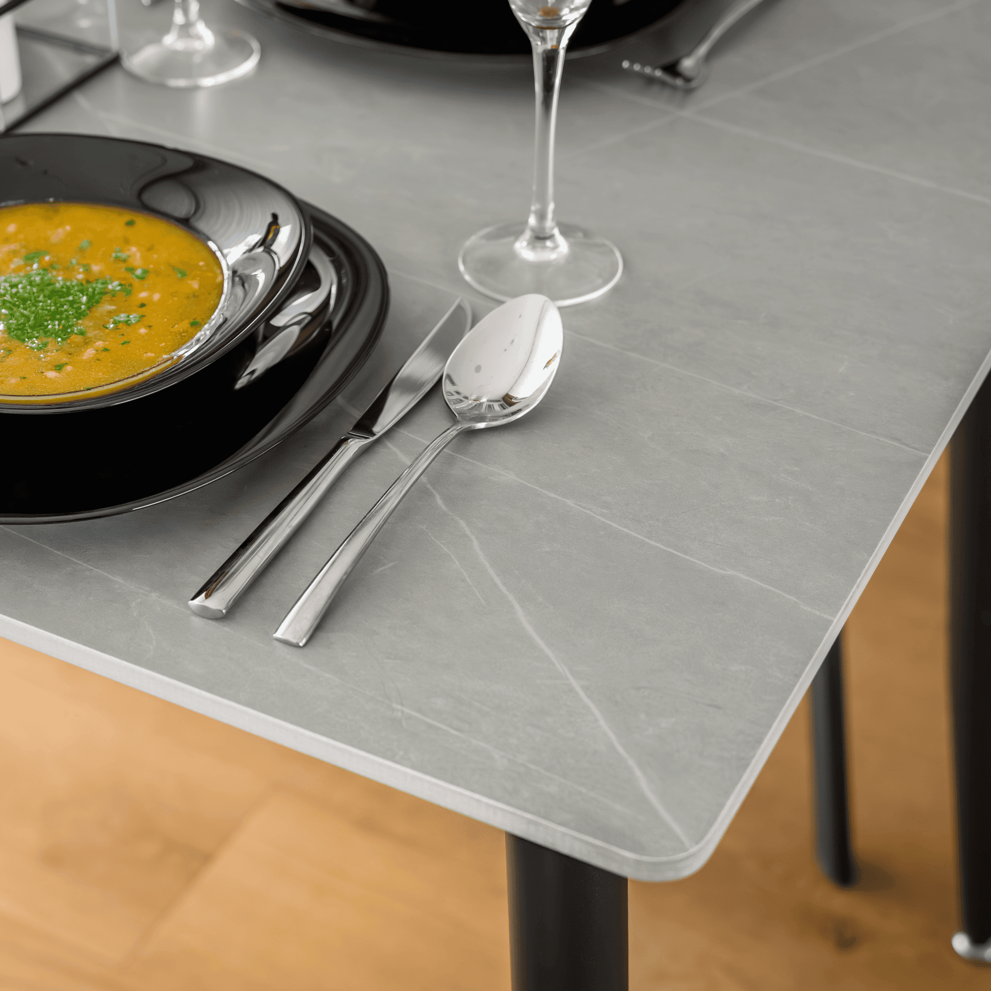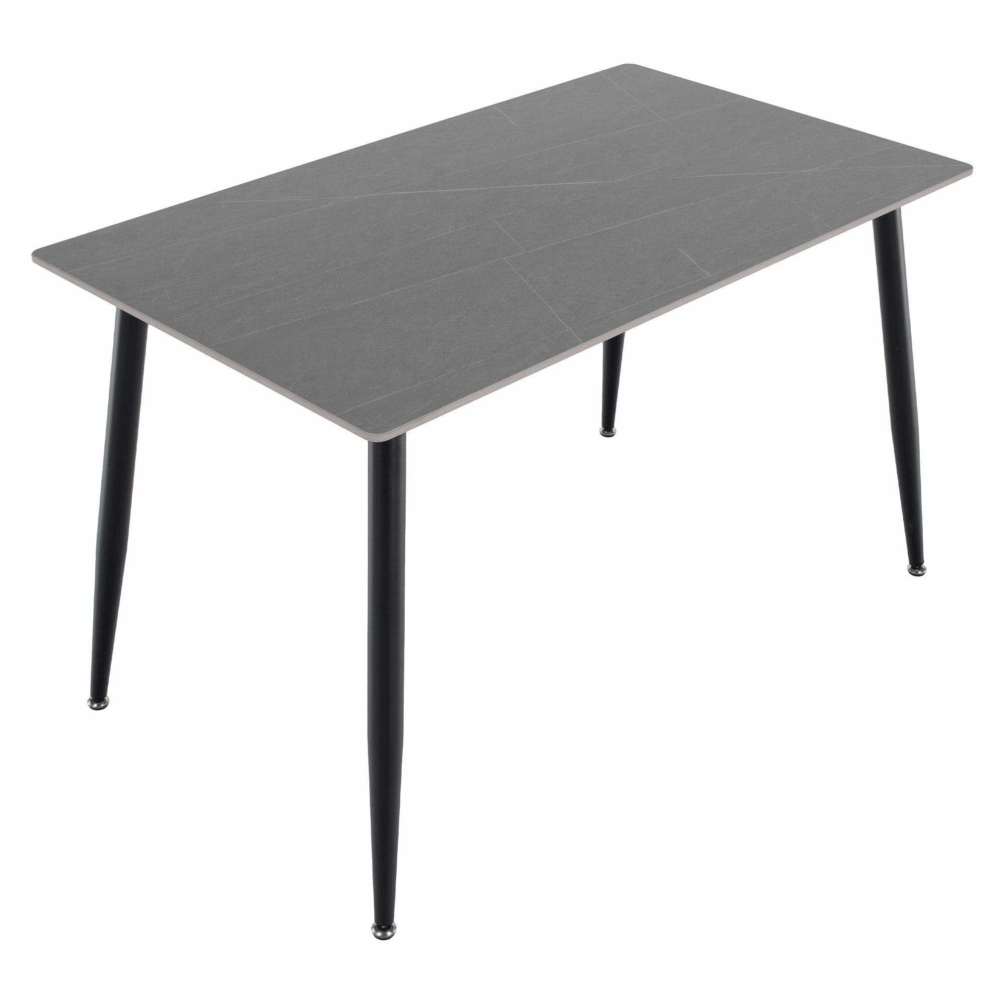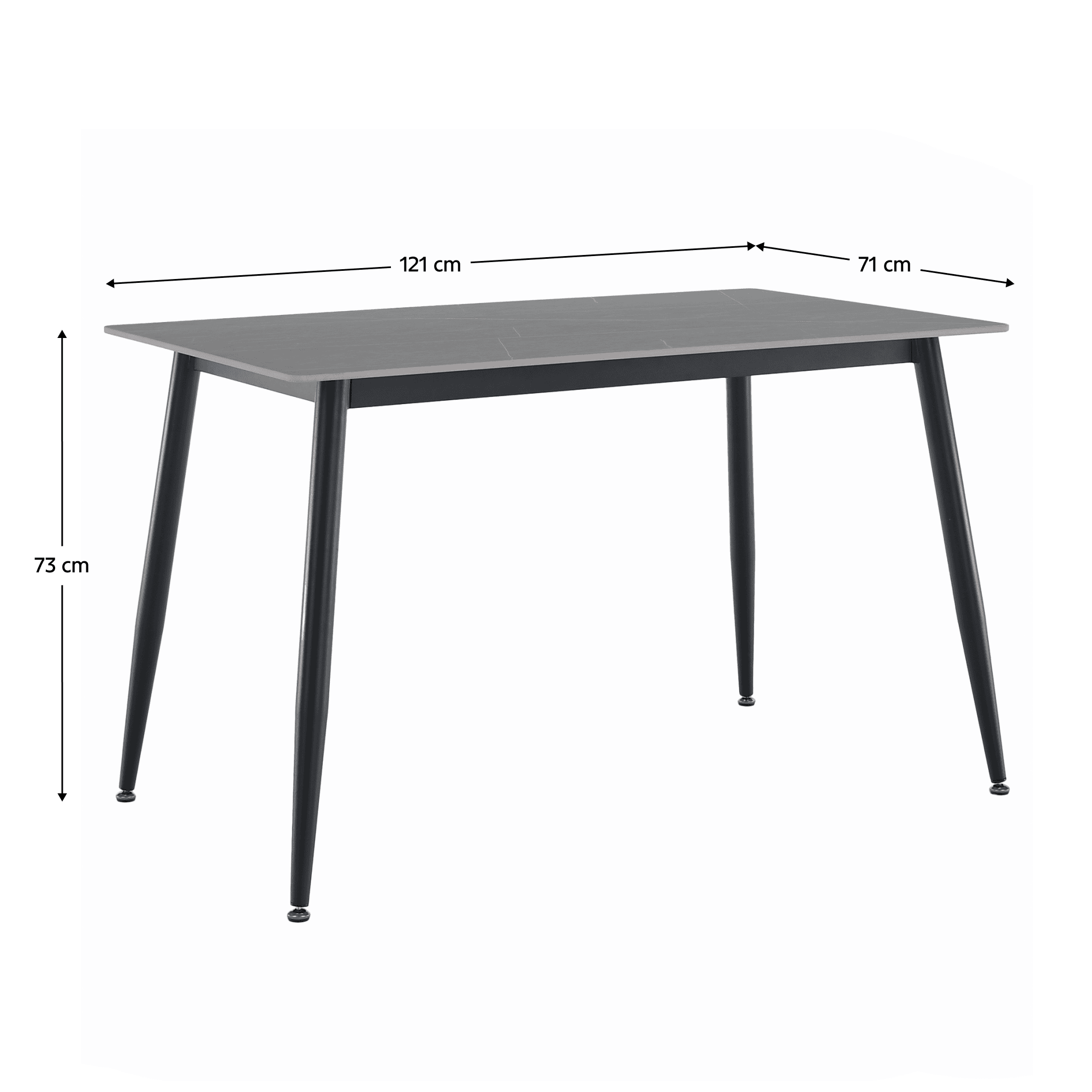 Material: piatră/oţel Culoare: marmură gri/negru Dimensiuni (Lxlxh): 121x71x73 cm Grosimea blatului de piatră: 1,07 cm Portanţă: 50 kg Practic Design modern Potrivit pentru 4-6 persoane Livrat dezasamblat