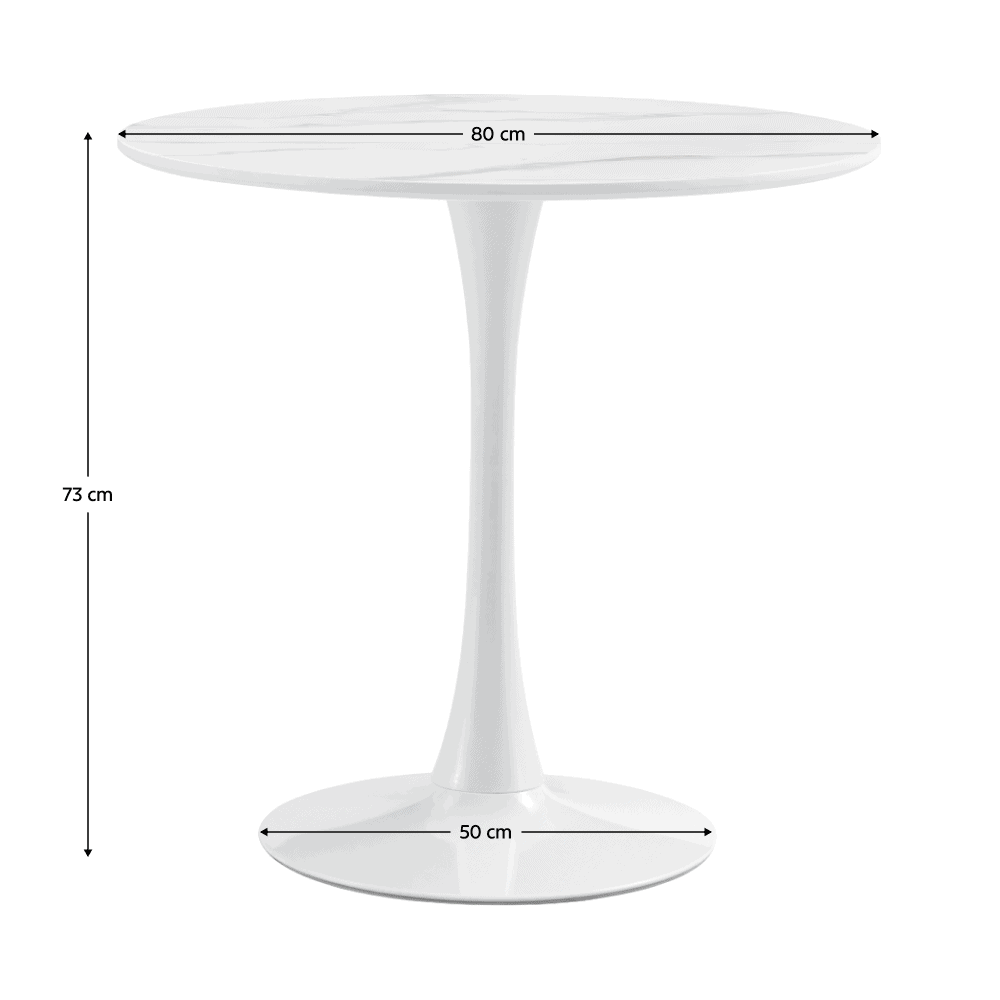 Material: placă de piatră/metal Culoare: marmură deschisă/alb Dimensiuni (diametru x h): 80×73 cm Diametrul bazei: 50 cm Grosimea blatului de piatră: 1,1 cm Portanţă: 50 kg Rotund Practic Design modern Design elegant Nu se descompune Bază metalică Livrat dezasamblat