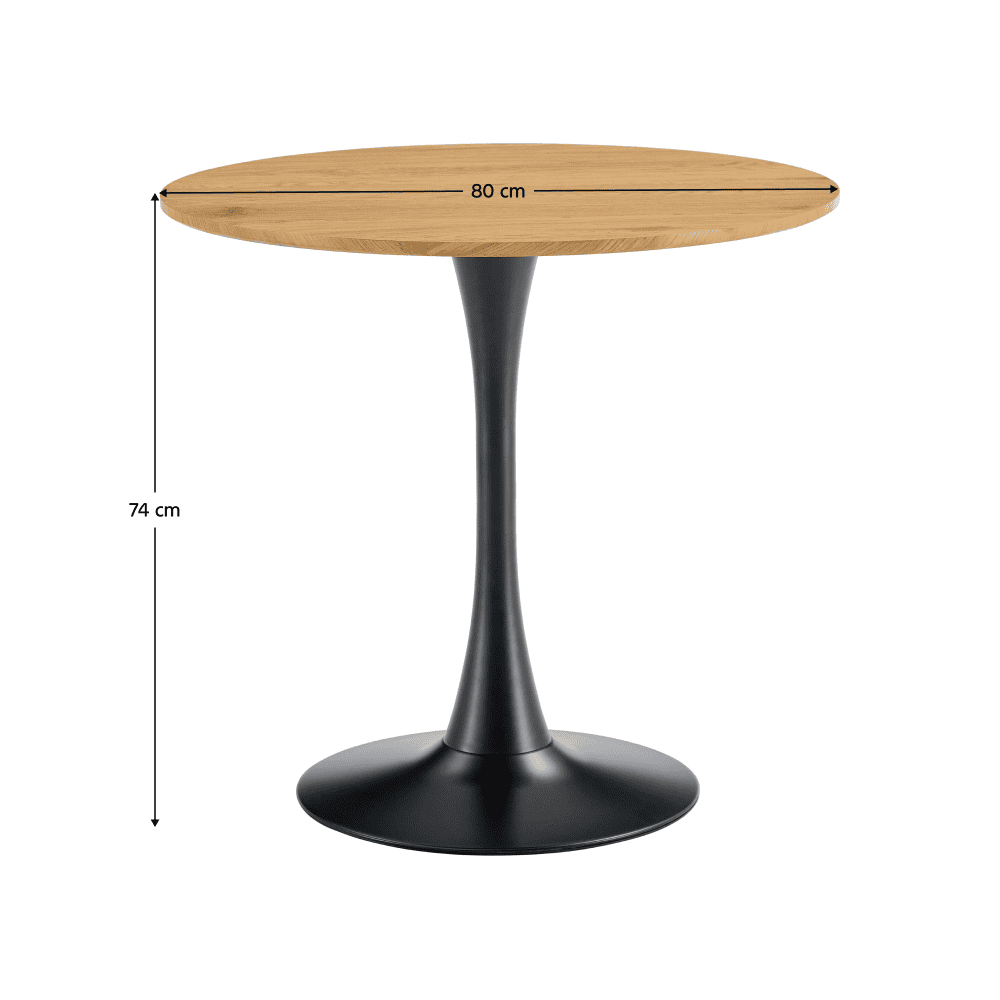 Material: MDF înfoliat/metal Culoare: stejar (vopsea mată)/negru Dimensiuni (diametru x h): 80×74 cm Grosimea blatului de masă: 1,8 cm Diametrul bazei: 50 cm Bază metalică Design modern Rotundă Livrată dezasamblată