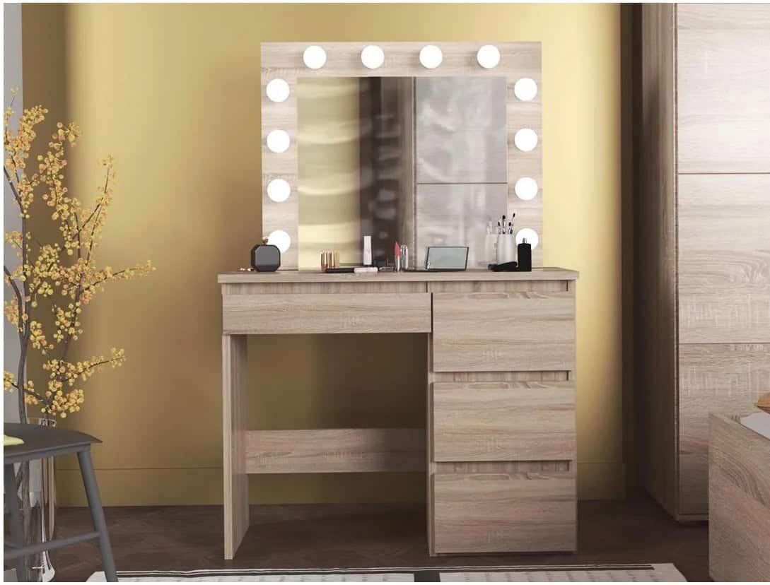 Masa de toaleta si machiaj Hollywood cu oglinda LED si 4 sertare, 94x43x140 cm, stejar Mob360 – produs disponibil în magazinul Mob360.