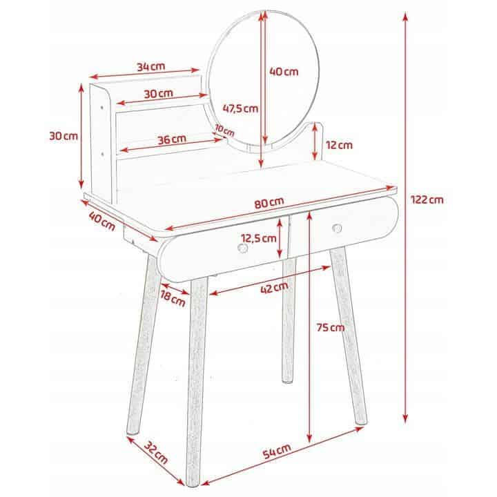 Aceasta piesa de mobilier este perfecta pentru dormitor, fiind un loc practic pentru machiaj, coafura, ingrijirea zilnica a frumusetii, precum si pentru a scrie o scrisoare sau pentru a depozita o varietate de obiecte mici. UTILIZARE OPTIMA SI PRACTICA – sertare, ideale pentru cosmetice, bijuterii, chitante, instrumente de scris si orice obiecte mici care vor avea in sfarsit locul lor,- rafturi convenabile pentru a tine obiectele folosite zilnic, cum ar fi crema de maini, un recipient de perii pentru pudra, parfum si accesorii pentru par,- o suprafata de lucru care va permite, de asemenea, sa folositi masuta de toaleta ca birou,- o oglinda, astfel incat sa va puteti vedea coafura si machiajul in detaliu din toate partile,- o zona de depozitare convenabila pentru taburete SPECIFICATIILE PRODUSULUI Material Tabla MDFCuloare alb fagInaltimea mobilierului 122 cmLatimea mobilierului 80 cmAdancimea mobilierului 40 cmDiametrul oglinzii 40 cmAsamblare Pentru autoasamblare *Articolele prezentate in imagine (bijuterii, cosmetice) nu fac parte din masa de toaleta.