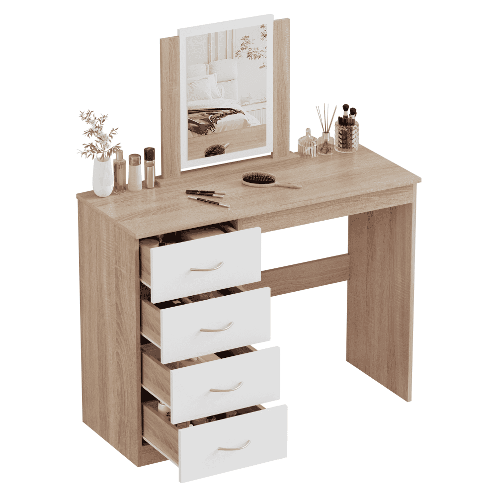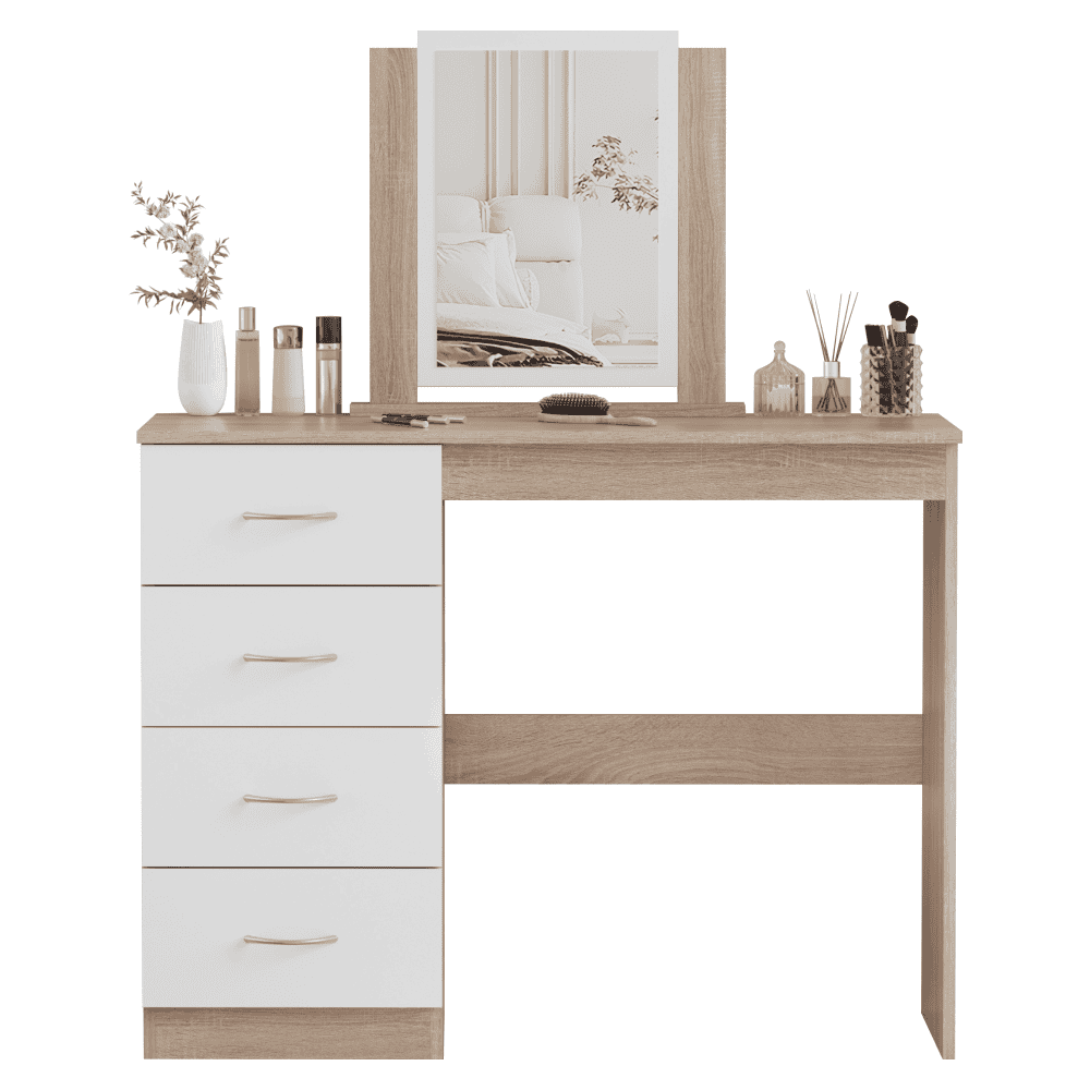 Material: MDF laminat Culoare: stejar sonoma/alb Dimensiuni (lxAxh): 100×40,5×125 cm Grosimea materialului: 1,7 cm Cu spaţiu de depozitare 4 sertare Dimensiunile sertarelor (Lxh): 36,5×17 cm Portanţă sertar: 15 kg Portanţa blatului superior: 55 kg Cu mânere Material mâner: plastic Culoare mâner: argintiu Cu oglindă Dimensiuni oglindă (Lxh): 30×42,5 cm Design modern Livrat dezasamblat
