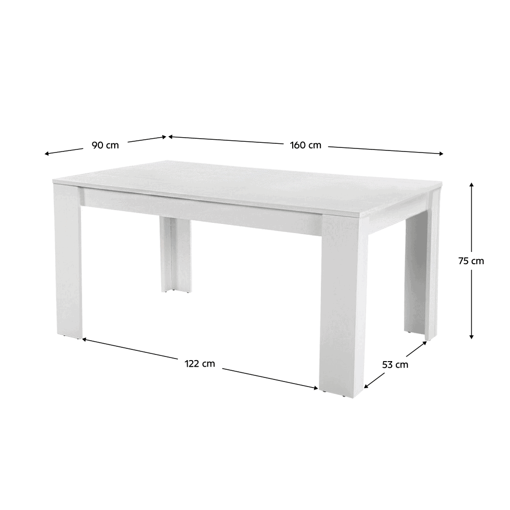 Masa dining, material: PAL melaminat, culoare: alb, suprafaţa mesei 140×80 cm potrivită pentru 4-6 persoane sau suprafaţa mesei 160×90 cm potrivită pentru 6-8 persoane. Dimensiuni (LxAxH): 140x80x75 cm sau 160x90x75 cm.
