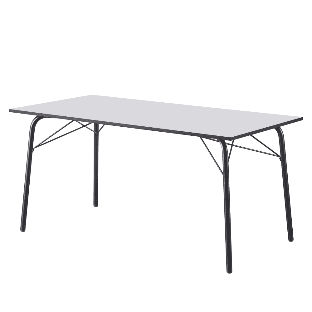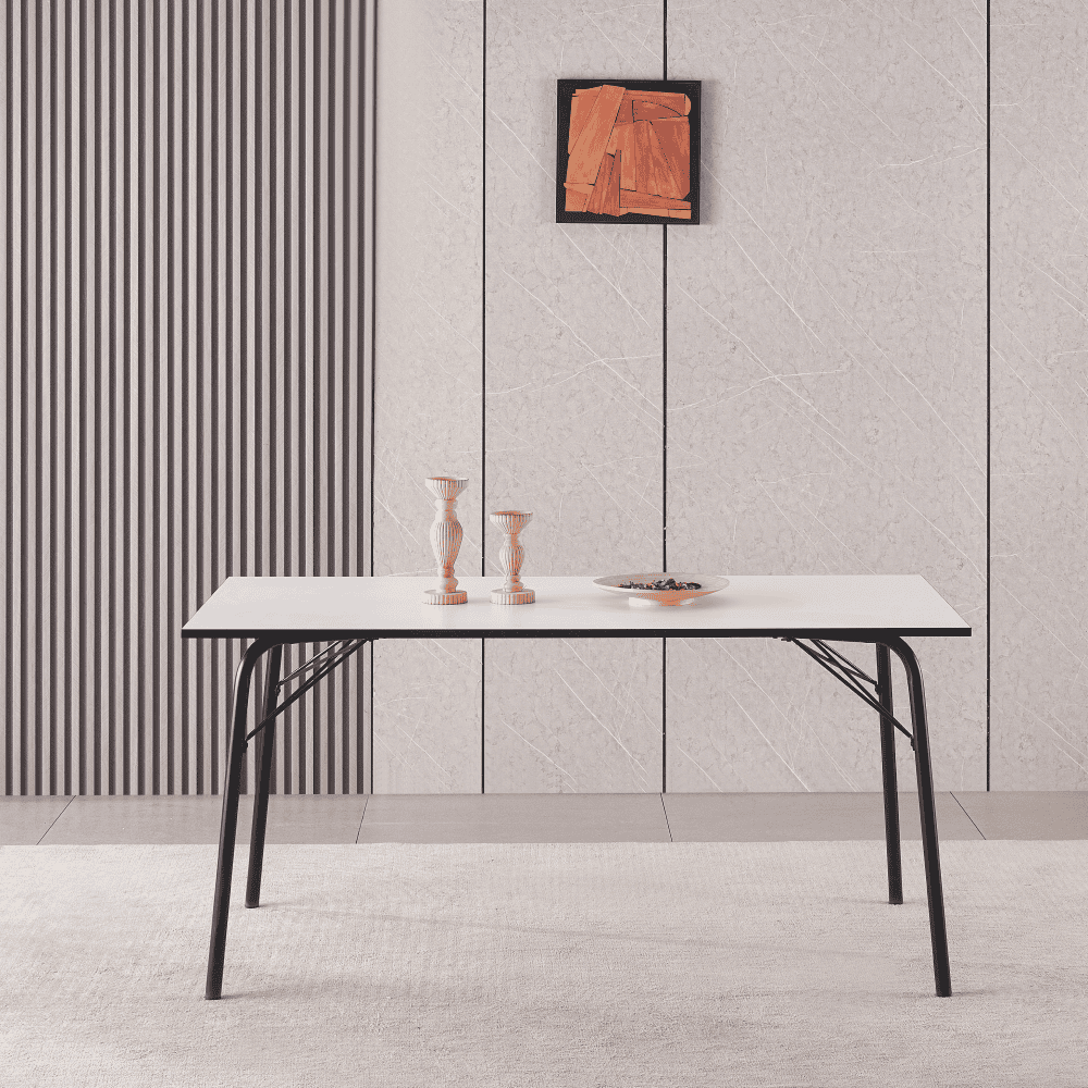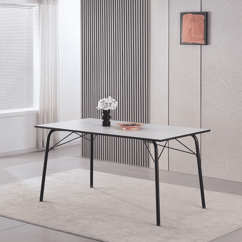 Material: MDF / metal Culoare: albă / neagră Dimensiuni (LxAxÎ): 160x80x75 cm Grosimea materialului plăcii superioare: 1,8 cm Capacitate de încărcare: 25 kg Simplă Minimalistă Design clasic Picioare metalice Uşor de întreţinut Cu glisoare pentru protecţia podelei Masă dining pentru 6-8 persoane Livrată dezasamblată