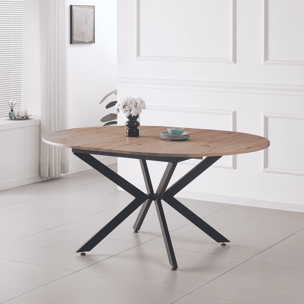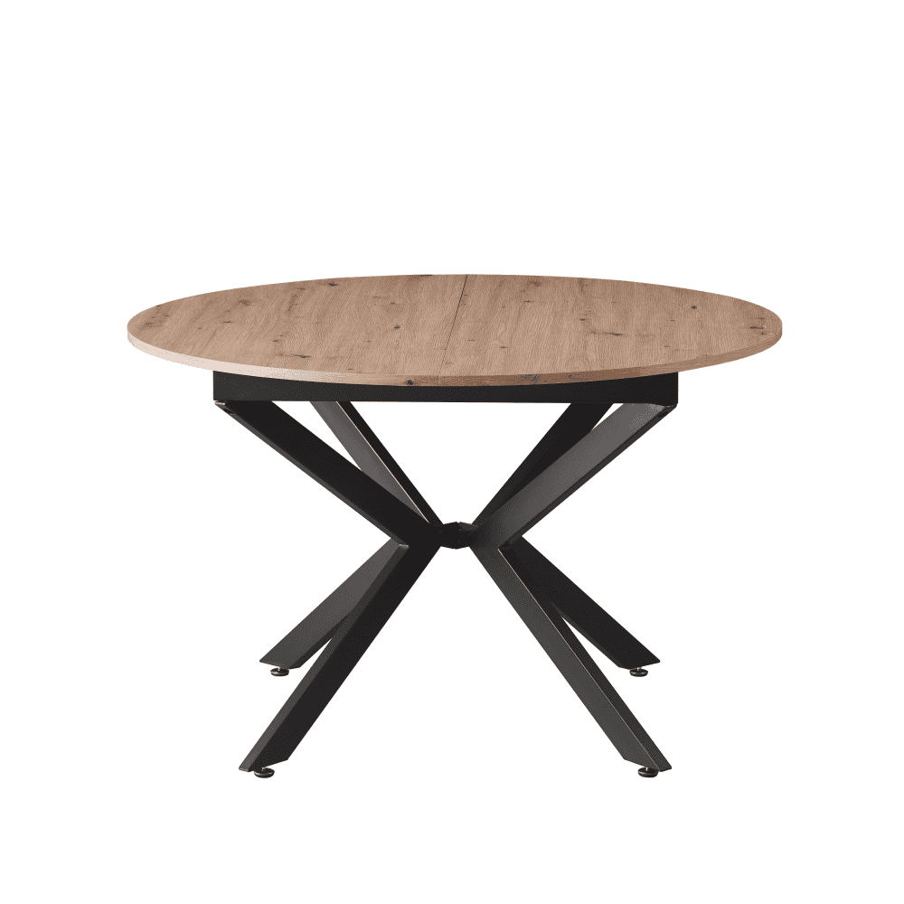 Material: MDF / metal Materialul blatului de masă: MDF Culoare: stejar artisan Construcţia picioarelor: metal Culoare: neagră Dimensiuni (LxAxÎ): 120×120-160×75 cm Grosimea materialului plăcii superioare: 1,8 cm Rotundă Practică Potrivit pentru 4-6 persoane Capacitate de încărcare: 35 kg Livrată dezasamblată