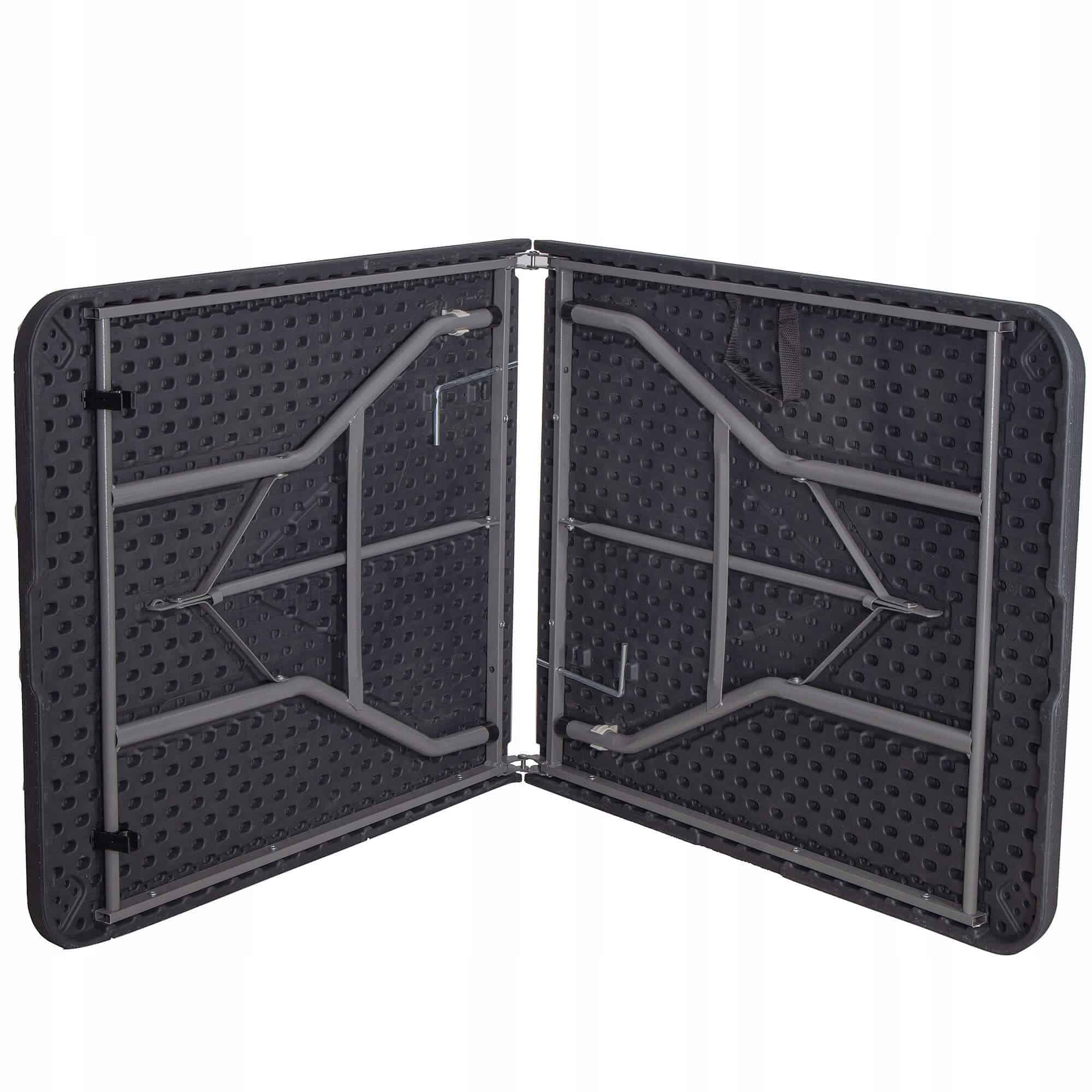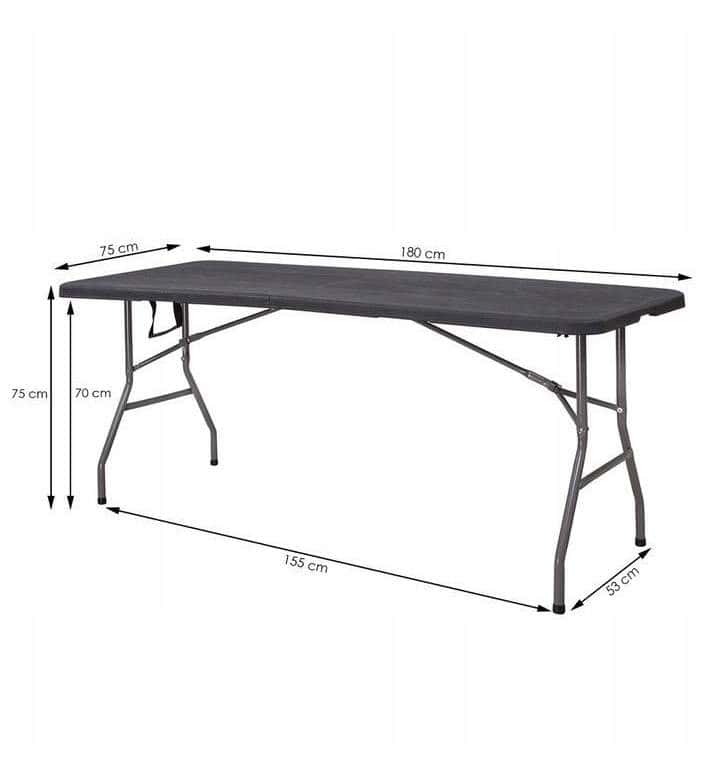 Masa pliabila este elementul perfect pentru orice eveniment, banchet sau excursie turistica de familie. Datorita posibilitatii de a o plia sub forma de valiza, va puteti deplasa convenabil cu ea literalmente oriunde. In plus, are un maner care usureaza transportul.Pana la opt persoane pot sta la masa, permitandu-va sa petreceti timp cu cei dragi in conditii confortabile.Blatul mesei este gros, masiv si are margini rotunjite.Pentru siguranta marita, masa este echipata cu o incuietoare. Astfel, dupa desfacerea mesei, nu trebuie sa va faceti griji cu privire la stabilitatea ei. Caracteristici: Dimensiunea este perfecta pentru 8 persoane Blatul mesei este rezistent la diverse conditii meteorologice Blatul de masa gros si puternic suporta o greutate de pana la 150 kg Are elemente antiderapante la capetele picioarelor Material de masa usor de curatat Specificatii: culoare blat: nuanta de negru culoare cadru: gri material: HDPE, metal dimensiuni blat masa: 180×75 cm grosime blat: 4 cm inaltime totala: 75 cm inaltime pana la blat: 70 cm distanta intre picioare: 155 cm si 53 cm grosime tuburi cadru: 24.5 mm, 16 mm dimensiuni dupa pliere: 75x90x8 cm lungime maner: 12 cm latime curea de la maner: 2.5 cm