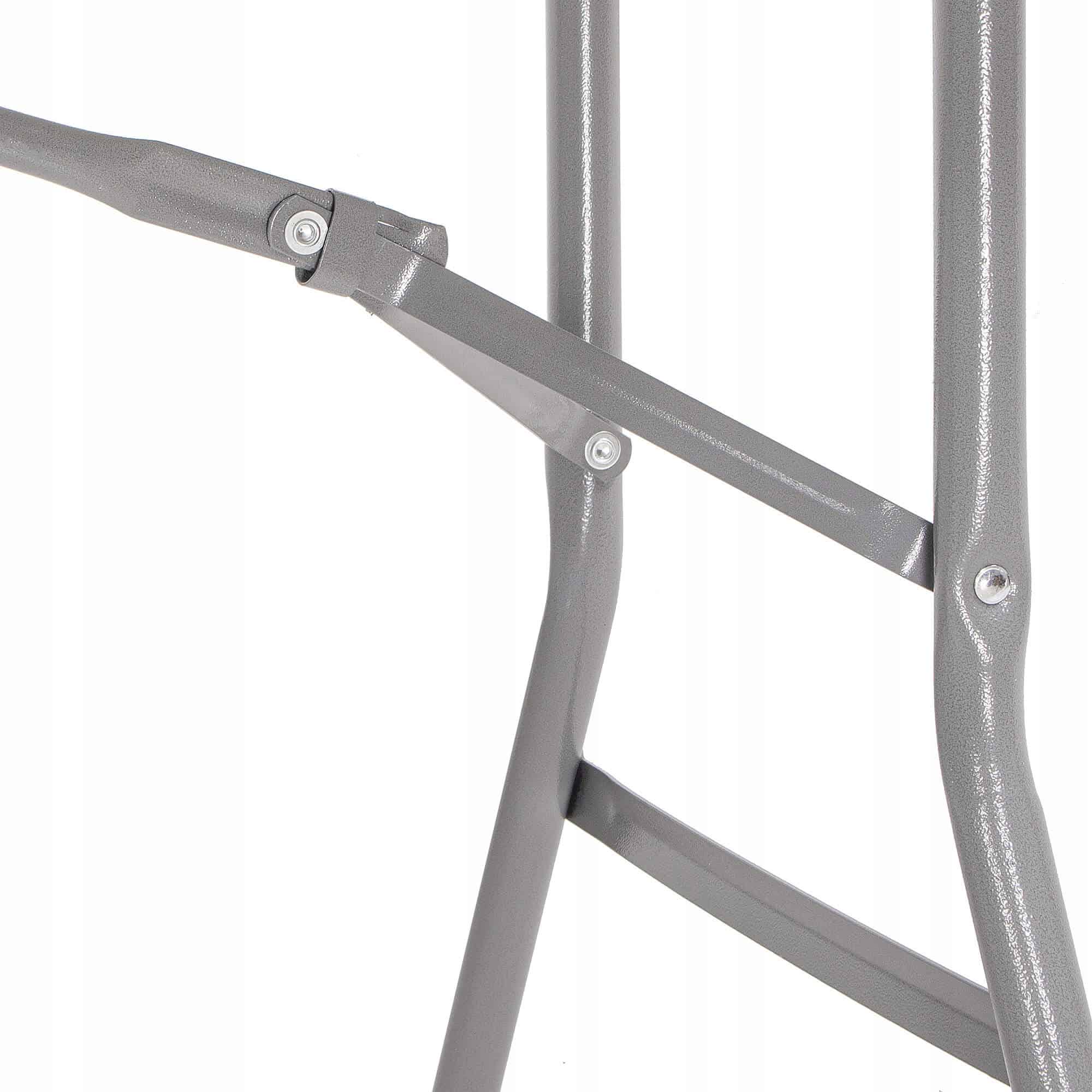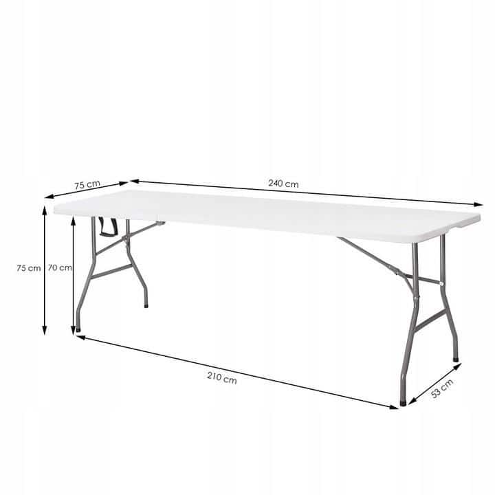 - HDPE, metal dimensiuni blat masa: 240×75 cm grosime blat: 4 cm inaltime totala: 74 cm inaltime pana la blat: 70 cm distanta intre picioare: 155 cm si 53 cm grosime tuburi cadru: 24.5 mm, 16 mm dimensiuni dupa pliere: 122x75x8.5 cm lungime maner: 12 cm latime curea de la maner: 2.5 cm