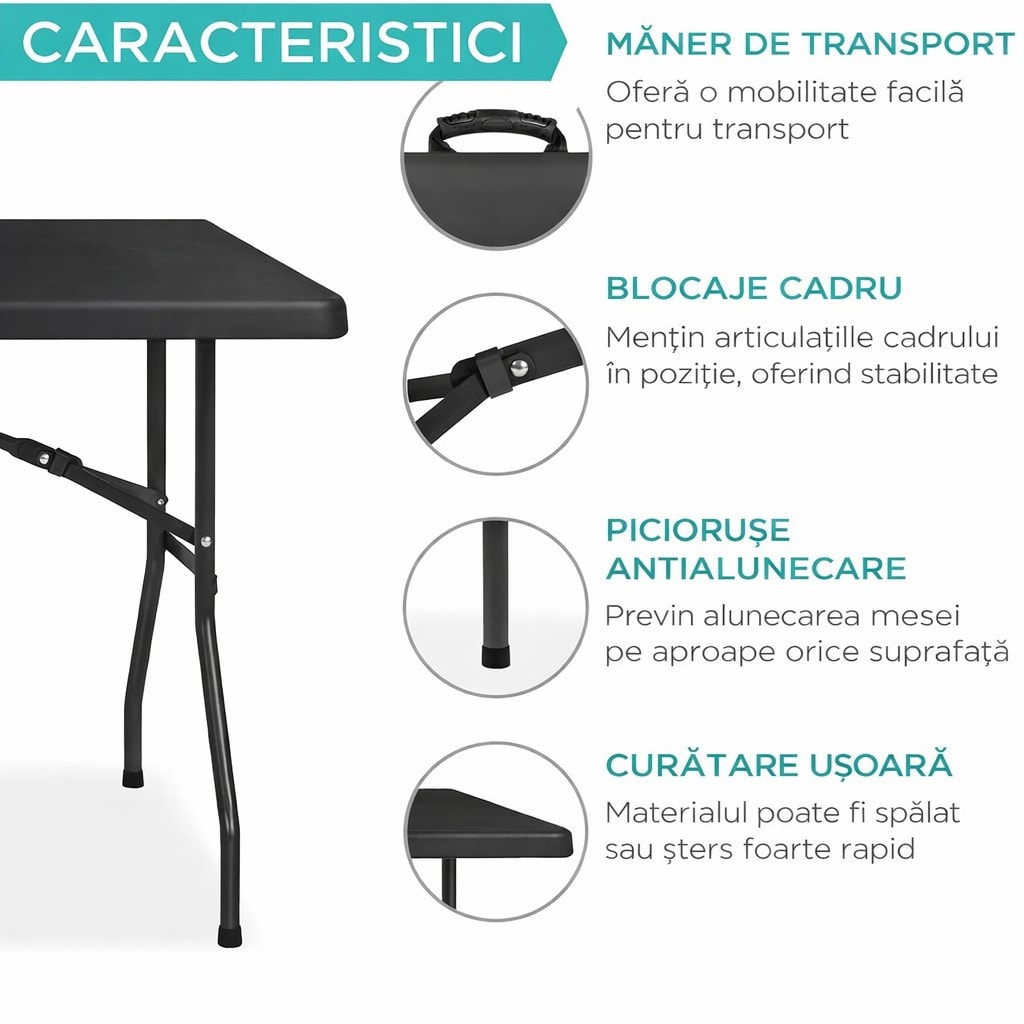 - Dimensiunea este perfecta pentru 10 persoane Blatul mesei este rezistent la diverse conditii meteorologice Blatul de masa gros si puternic suporta o greutate de pana la 150 kg Are elemente antiderapante la capetele picioarelor Material de masa usor de curatat Specificatii: culoare blat: negru culoare cadru: gri inchis material: