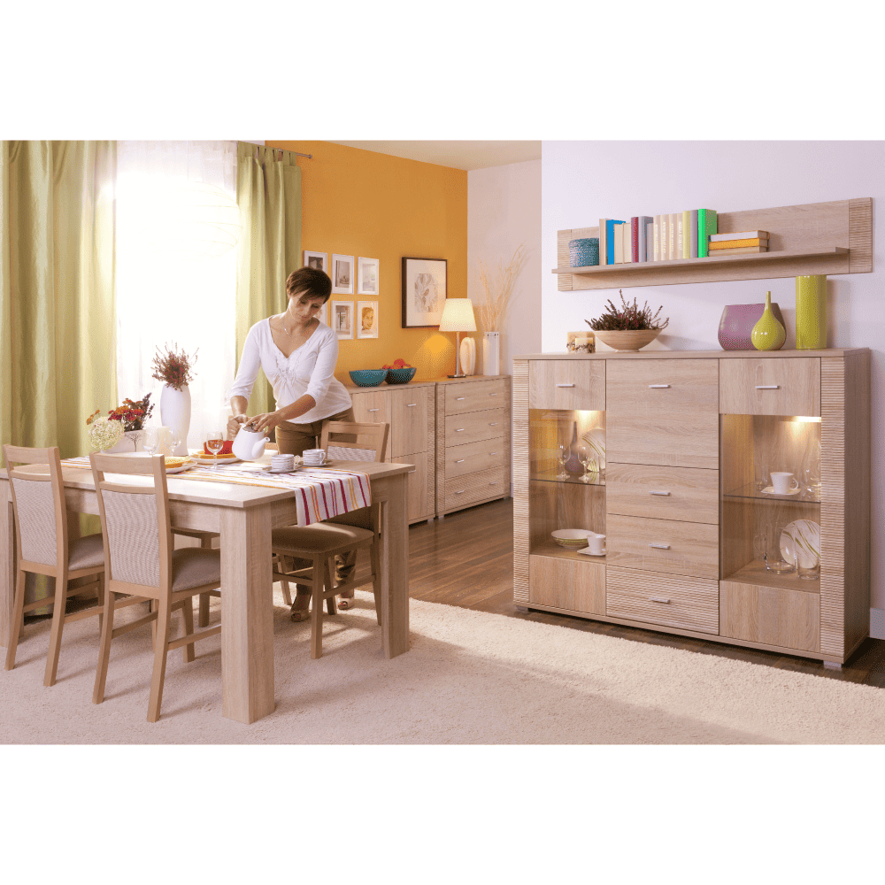 Masă dining extensibilă tip 12, potrivită pentru camera de zi, dormitor sau birou. Material: PAL laminat. Marginile sunt terminate cu o bandă zimţată. Culoare: stejar sonoma. Dimensiuni (LxHxA): 160x77x90 cm, , După extindere 210x77x90 cm. Grosimea materialului la corp: 16 mm