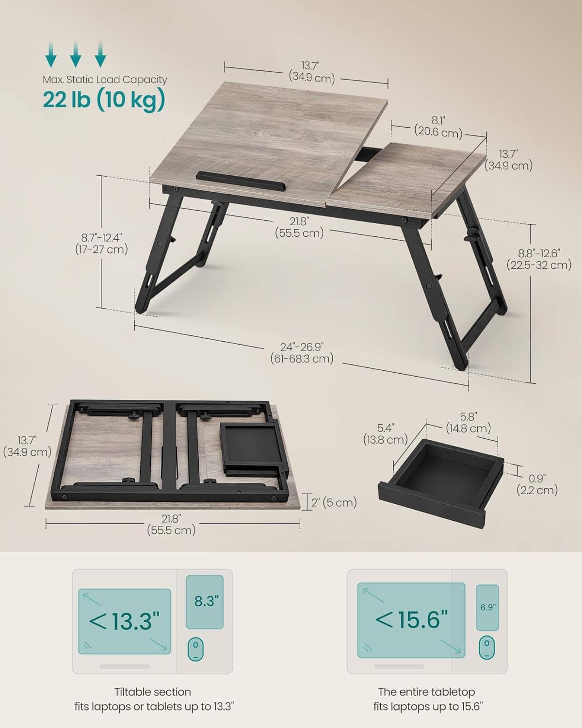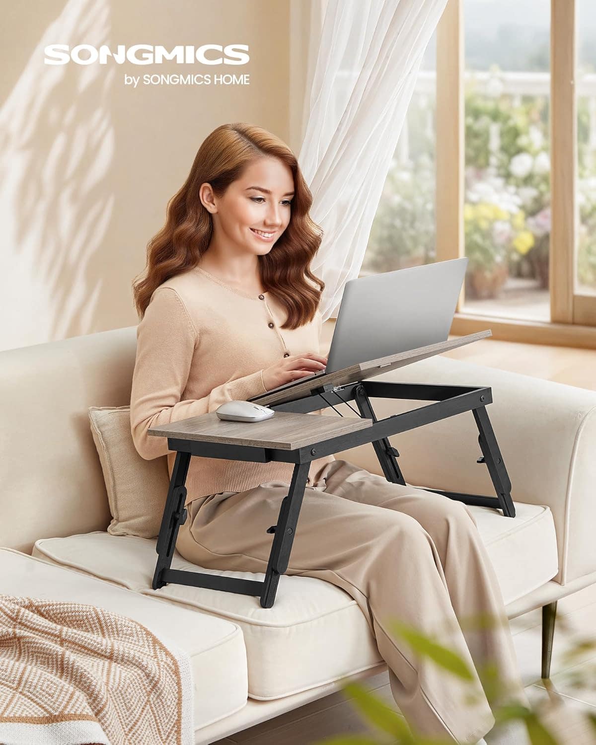Specificatii tehnice Brand: SONGMICS Model: LLD105W01 Material: Bambus (picioare), PAL (blat din lemn stratificat) Culoare: Gri Dimensiuni produs: 68.3 x 34.9 x 32 cm Inaltime reglabila: 22.5 – 32 cm Unghi reglabil: 6 pozitii Capacitate maxima: 10 kg Caracteristici speciale: Blat cu opritor antialunecare, sertar lateral, picioare pliabile Utilizare recomandata: Laptop, citit, mic dejun, desen Scurta descriere Masa pentru laptop SONGMICS este un accesoriu multifunctional, conceput pentru confort si ergonomie. Cu blat reglabil pe unghi si inaltime, permite adaptarea pozitiei pentru lucru sau relaxare. Picioarele din bambus si structura solida sustin pana la 10 kg, iar sertarul lateral adauga spatiu suplimentar pentru accesorii mici. Pliabila si usor de depozitat, este practica atat acasa, cat si in deplasare. Caracteristici principale Blat reglabil pe inaltime si unghi pentru confort optim Opritor antialunecare pentru siguranta dispozitivului Picioare pliabile din bambus pentru stabilitate si transport facil Sertar lateral pentru accesorii mici Structura solida cu capacitate de 10 kg Utilizare versatila: pat, birou, balcon sau canapea