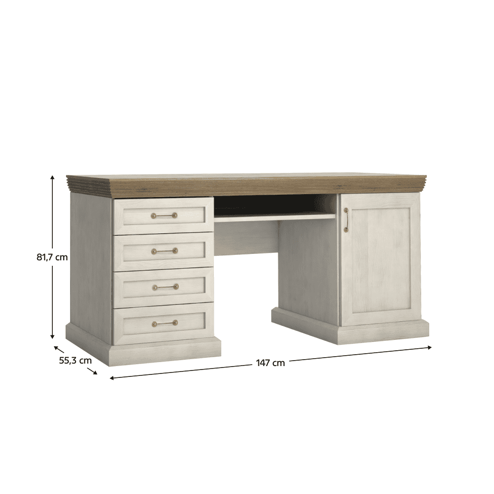 Material: PAL melaminat / benzi decorative / metal Culoare: pin nordic / stejar sălbatic Dimensiuni (LxAxÎ): 147×55,3×81,7 cm Înălţime bază: 9 cm Înălţimea plăcii superioare: 8 cm Patru sertare Extensie pentru tastatură Dulap cu raft Grosimea materialului modulului: 15 cm Grosimea materialului plăcii superioare: 22 mm Capacitatea de încărcare a raftului şi sertarului: 5 kg Livrată dezasamblată