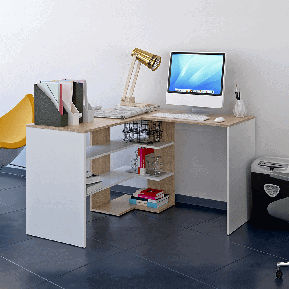 Material: DTD laminat Culori: stejar sonoma/alb Dimensiuni (Lxlxh): 120x120x75,4 cm Grosimea materialului: 1,6 cm Colţ Spaţiu de depozitare deschis Cu poliţe Înălţime între rafturi: 22,8 cm Portanţa poliţei: 5 kg Portanţa mesei: 35 kg Picioare din plastic – glisoare Produs slovac de calitate Livrat dezasamblat