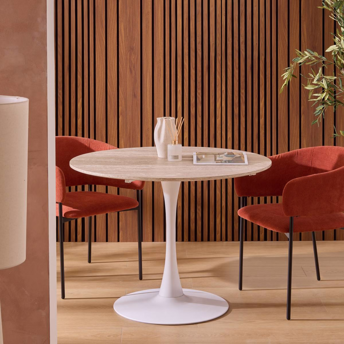 - Masa de dining Elias de la Atmosphera combina eleganta travertinului cu functionalitatea moderna. Blatul din MDF cu finisaj bej ofera un aspect natural si rafinat, in timp ce picioarele din otel asigura stabilitate si rezistenta. Este perfecta pentru un living sau o zona de dining cu stil contemporan. Caracteristici principale: