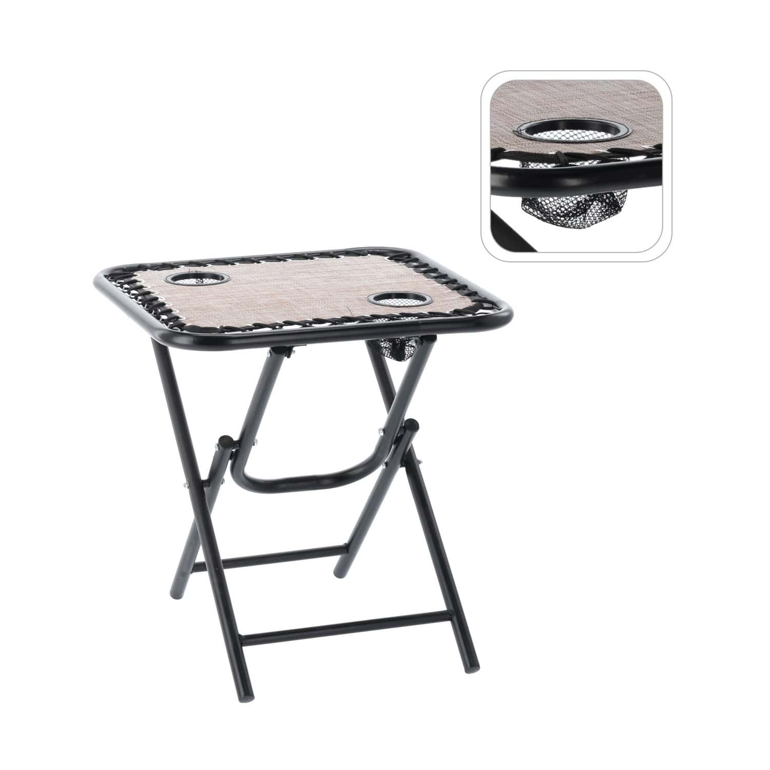 - Aceasta masa turistica pliabila este solutia practica pentru activitatile in aer liber. Compacta si usor de transportat, se monteaza rapid si ofera o suprafata stabila pentru bauturi, gustari sau diverse accesorii. Structura metalica asigura rezistenta si stabilitate, iar cele doua suporturi pentru pahare ofera confort in utilizare. Ideala pentru camping, picnic, pescuit sau relaxare in gradina. Caracteristici principale: