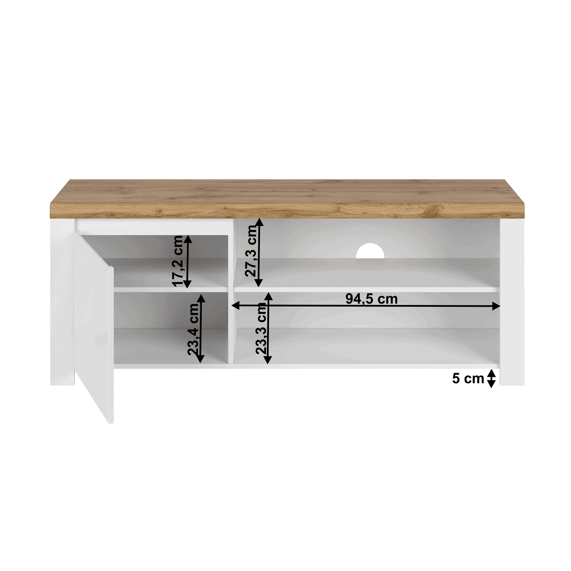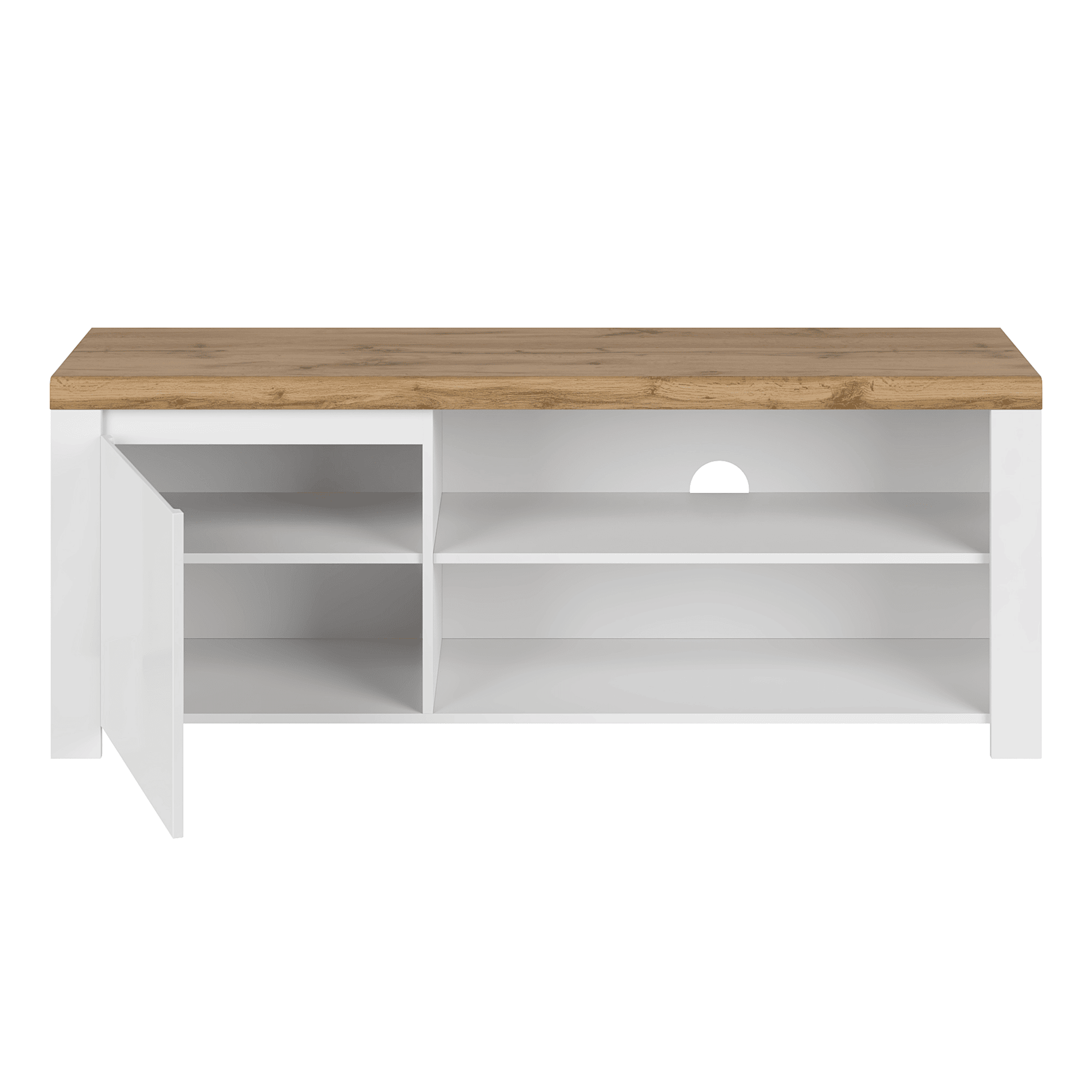 Material: DTD laminat/ canturi ABS/ MDF Culoare: alb foarte lucios/ stejar wotan Dimensiuni (LxAxÎ): 156×41,5×61 cm Înălţimea spaţiului inferior de la podea: 5 cm Grosimea materialului: 1,6 până la 2,2 cm Un dulap cu uşă În dulap, rafturi Înălţimea primului raft: 17,2 cm Înălţimea celui de-al doilea raft: 23,4 cm Spaţiu de depozitare deschis cu raft Dimensiuni spaţiu deschis inferior (LxÎ): 94,5×23,3 cm Înălţimea spaţiului deschis: 27,3 cm Orificiu de ieşire a cablului Uşă din MDF Livrată dezasamblată