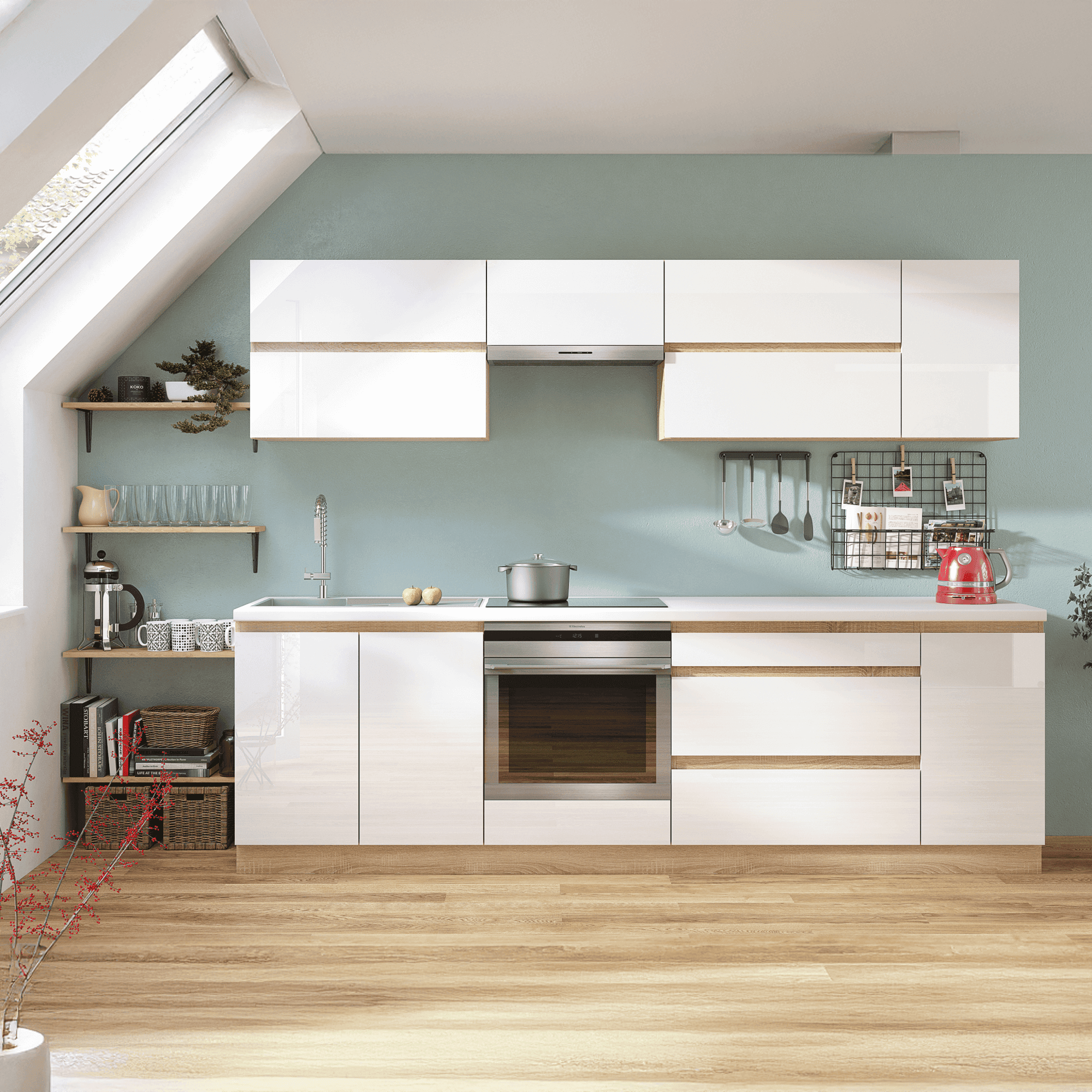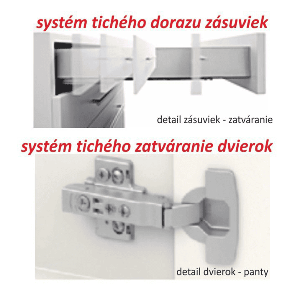 Material şi modelul de culori: PAL melaminat de calitate, de culoare alb extra lucios HIGH GLOSS, corp stejar sonoma.