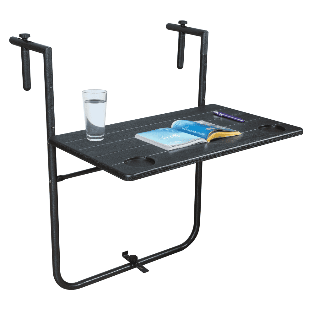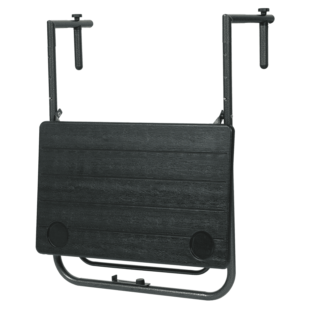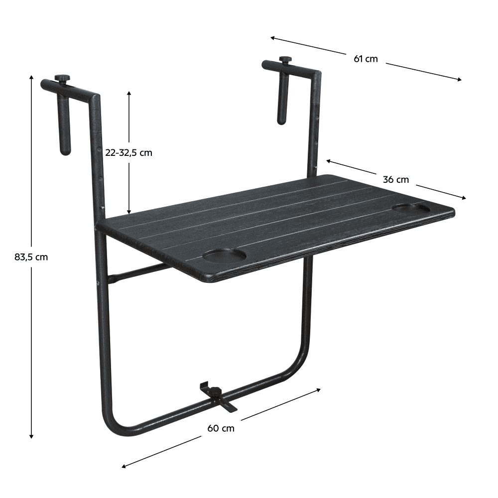 Material: otel/plastic Dimensiuni (lxAxh): 60x61x83,5 cm Culoare: negru Dimensiuni blat mese (lxA): 60×36 cm Grosimea blatului mesei: 3,7 cm Grosimea construcţiei: 1,2 – 2,2 cm Pliabilă Economisire spaţiu Dimensiuni atunci când este pliată (lxAxh): 60x22x83,5 cm Lăţimea recomandată a balustradei: 6,4 – 14,5 cm Capacitate reglabilă la înălţime: 50 kg 2 suporturi pentru pahare Potrivit pentru balcoane, terase sau locuri cu spaţiu limitat Se livrează demontat