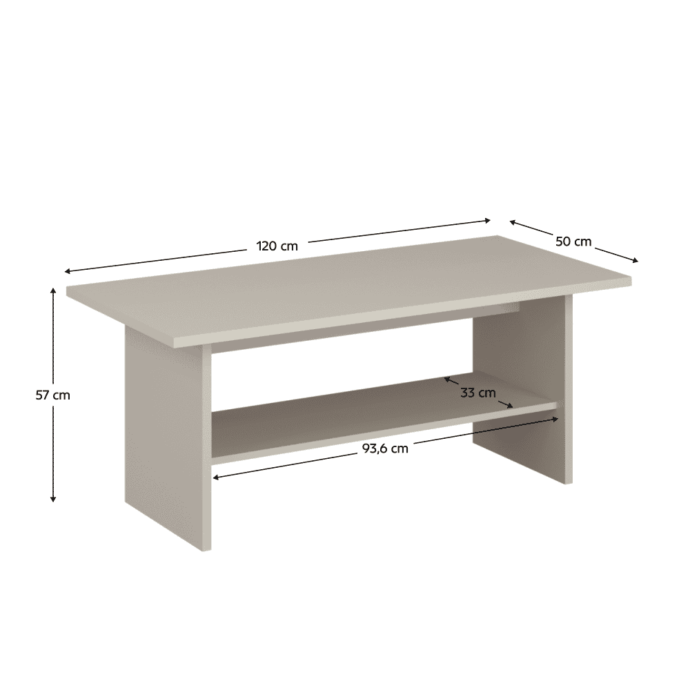 Material: DTD laminat Culoare: caşmir Dimensiuni (lxAxh): 120x50x57 cm Grosime material DTD: 1,6-3,2 cm Spaţiu de depozitare deschis Dimensiuni spaţiu de depozitare (lxA): Portanţa a spaţiului de depozitare 93,6×33 cm: 5 kg Portanţă placă superioară: 10 kg Design modern Livrată dezasamblată