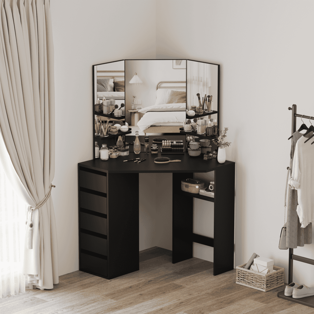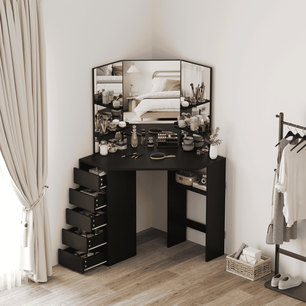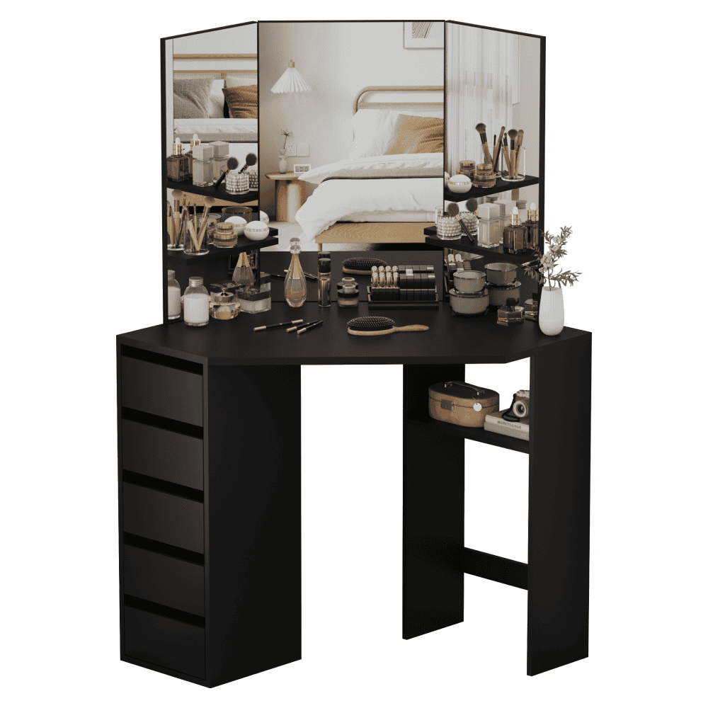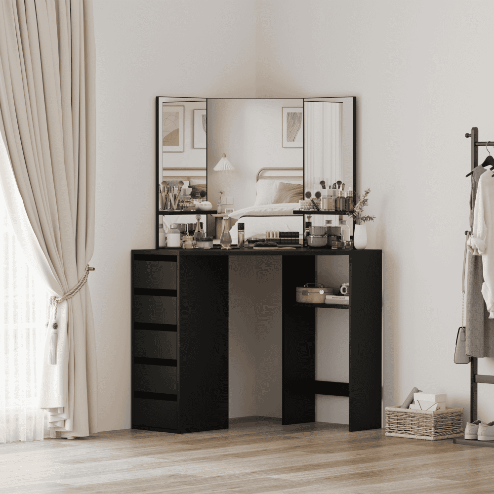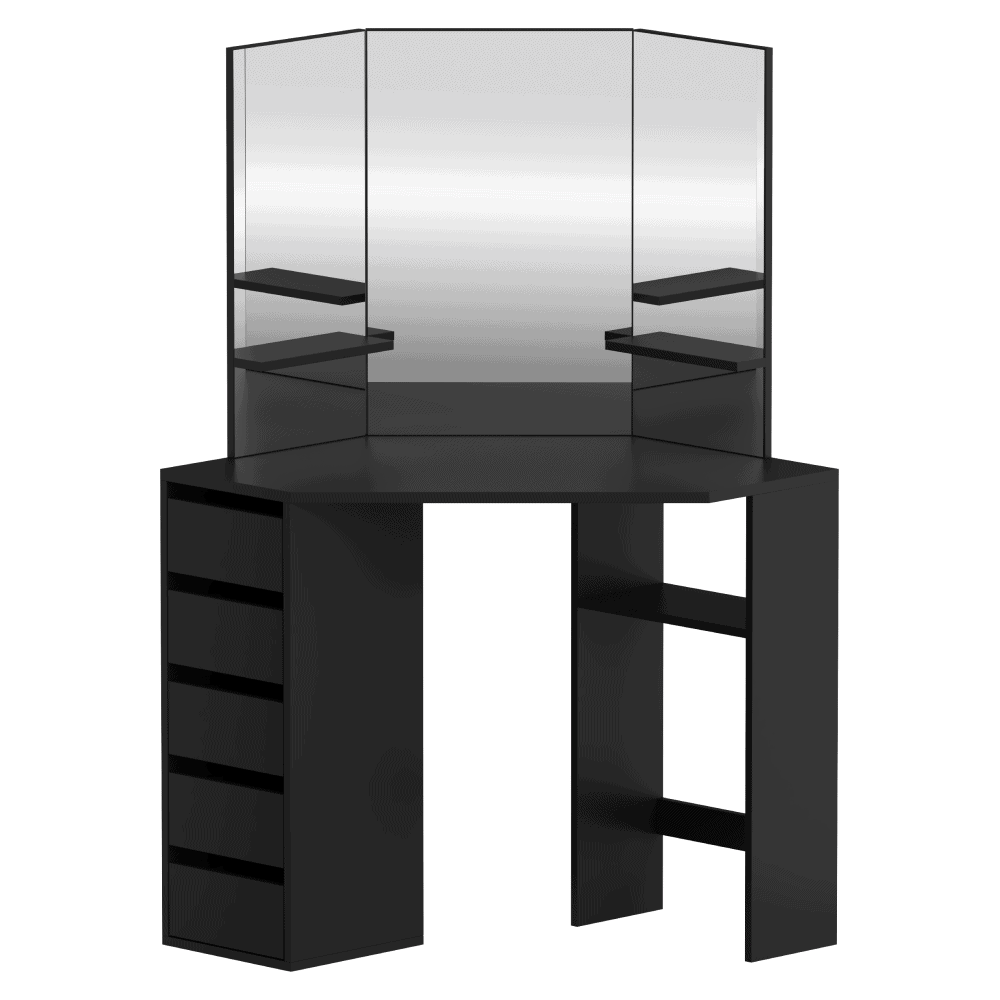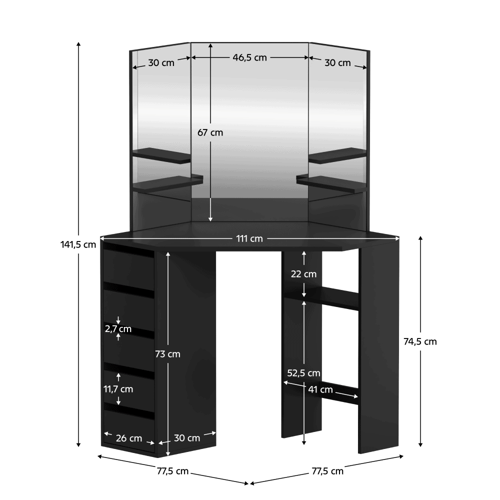 Material: MDF laminat Culoare: neagră Dimensiuni (lxAxh): 111x54x141,5 cm Adâncimea blatului de masă la mijloc: 54 cm Grosime material: 1,6 cm Colţ Cu sertar de depozitare Dimensiunile sertarului (Lxh): 26×11,7 cm Portanţă sertar: 15 kg Capacitatea de încărcare a poliţei: 10 kg Oglindă de 3 piese Design modern Recomandăm ataşarea de perete Livrat dezasamblat