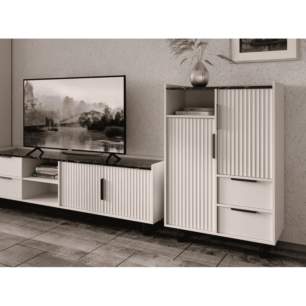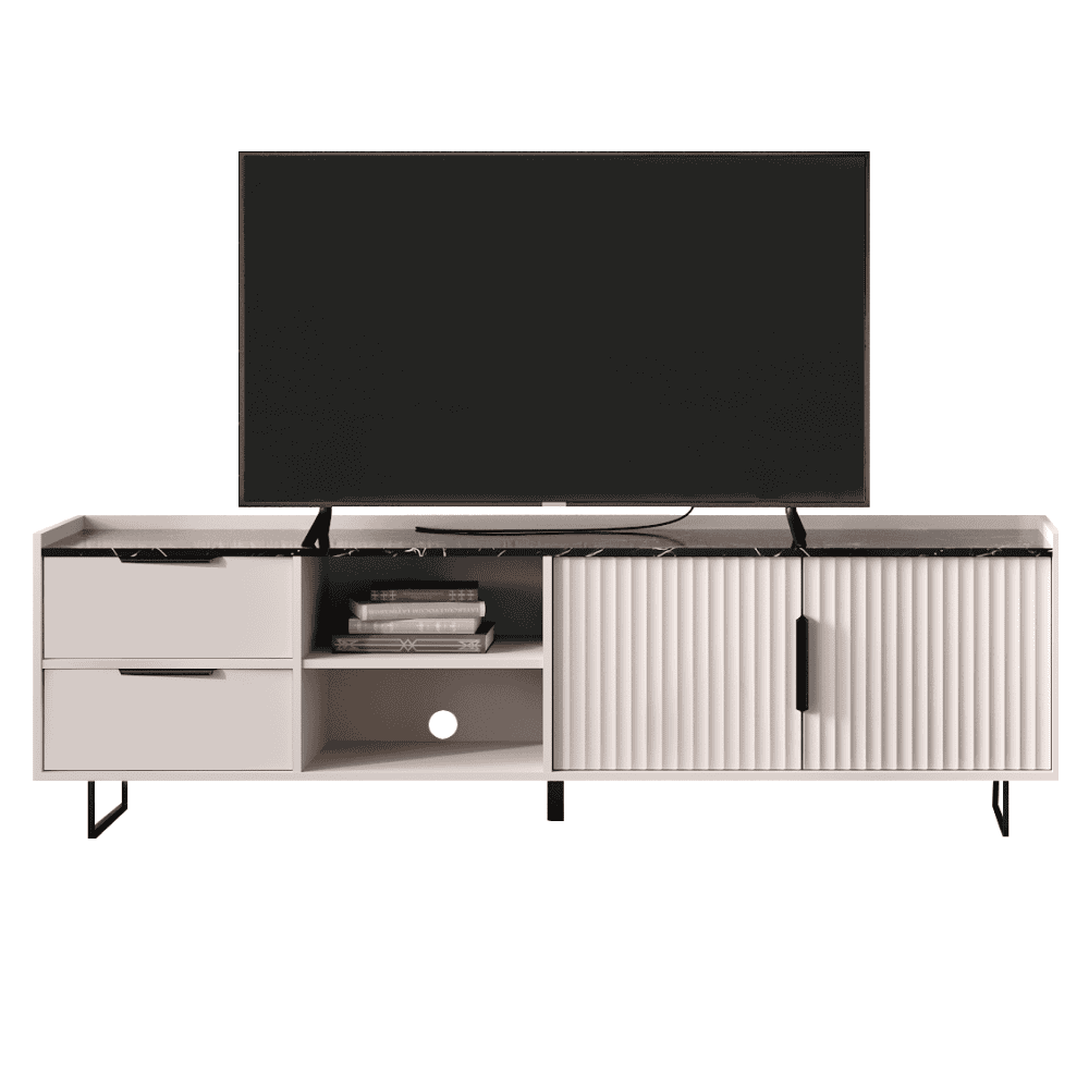 Material: DTD laminat/MDF înfoliat Culoare: caşmir/marmură neagră Dimensiuni (lxAxh): 200x42x60 cm Grosime material: 1,6 cm Cu două uşi Două sertare Spaţiu de depozitare deschis Portanţă poliţă: 4 kg Portanţă sertar: 2 kg Portanţa plăcii superioare: 15 kg Cu mânere Material mânere: metal Culoarea mânerelor: neagră Pe picioare Material picioare: metal Culoare picioare: neagră Înălţime picioare: 12 cm Picior central de sprijin Uşă decorativă Margini: hârtie acoperită cu polimeri termoreactivi Grosime DTD partea din spate/fund sertar: 0,3 cm Culoare partea din spate/fund sertar: alb şină cu bilă extensibilă complet Balamale Orificiu de trecere a cablului Design modern Recomandăm fixarea de perete Livrat dezasamblat