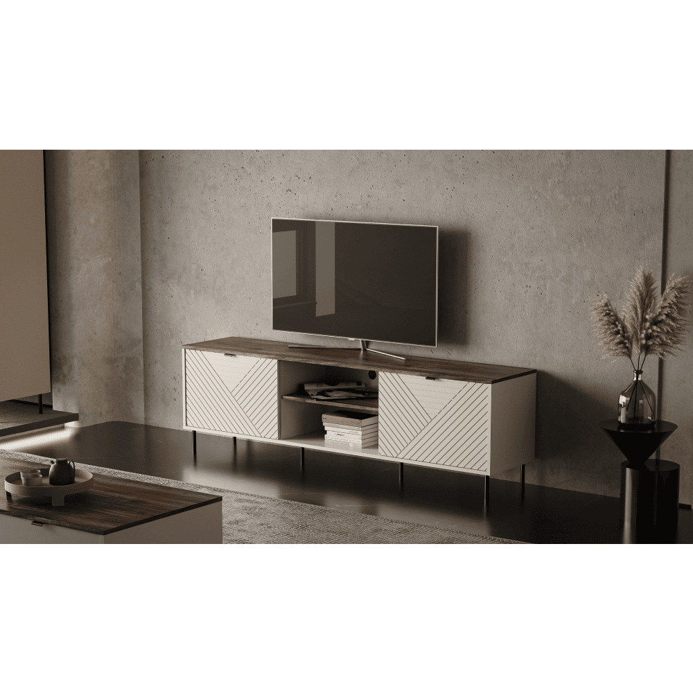 Material: DTD laminat/MDF înfoliat/margini ABS Culoare: caşmir/stejar castello Dimensiuni (Lxlxh): 183,4x40x55,2 cm Grosimea materialului: 1,6 cm Cu două uşi Două dulăpioare Dimensiuni dulăpior (Lxh): 59,6×39,6 cm De poliţe Lăţime poliţă: 58,3 cm Spaţiu de depozitare deschis Orificiu pentru cabluri Cu mânere Material mânere: metal Culoare mânere: neagră Pe picioare Materialul picioarelor: metal Culoarea picioarelor: neagră Înălţimea picioarelor: 12 cm Portanţă placă superioară: 10 kg Portanţa poliţă: 8 kg Uşi decorative Design modern Vă recomandăm să-l fixaţi de perete Livrat dezasamblat