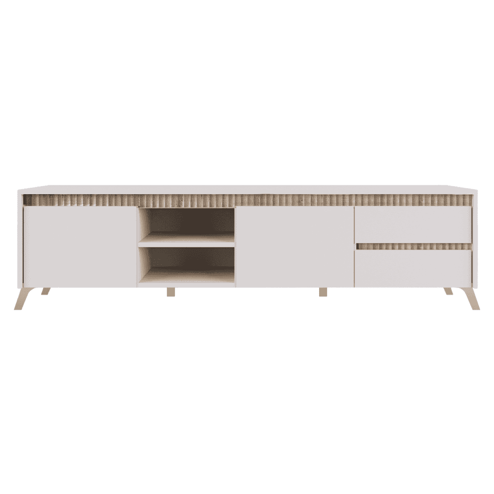 Material: DTD laminat /MDF înfoliat/folie PVC Culoare: caşmir/stejar sonoma Dimensiuni (lxAxh): 206x45x54 cm Grosime material: 1,6-1,9 cm Două dulapuri cu balamale Spaţiu de depozitare deschis Orificiu pentru trecerea cablurilor Două sertare Poliţă Cu picioare Culoarea piciorului: Înălţimea piciorului: 12 cm Rulmenţi cu bile extensibile complet Balamale Margine: hârtie impregnată cu polimeri termoreactivi/PVC Grosimea materialului ABS: 0,5 mm Grosime placă aglomerată partea din spate/fund sertar: 0,3 cm Culoare placă aglomerată partea din spate/fund sertar: alb Frezare decorativă Fără mânere Design modern Livrat dezasamblat
