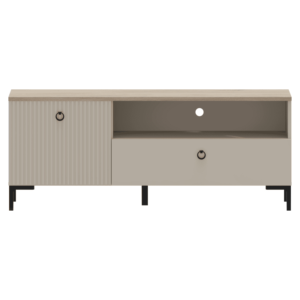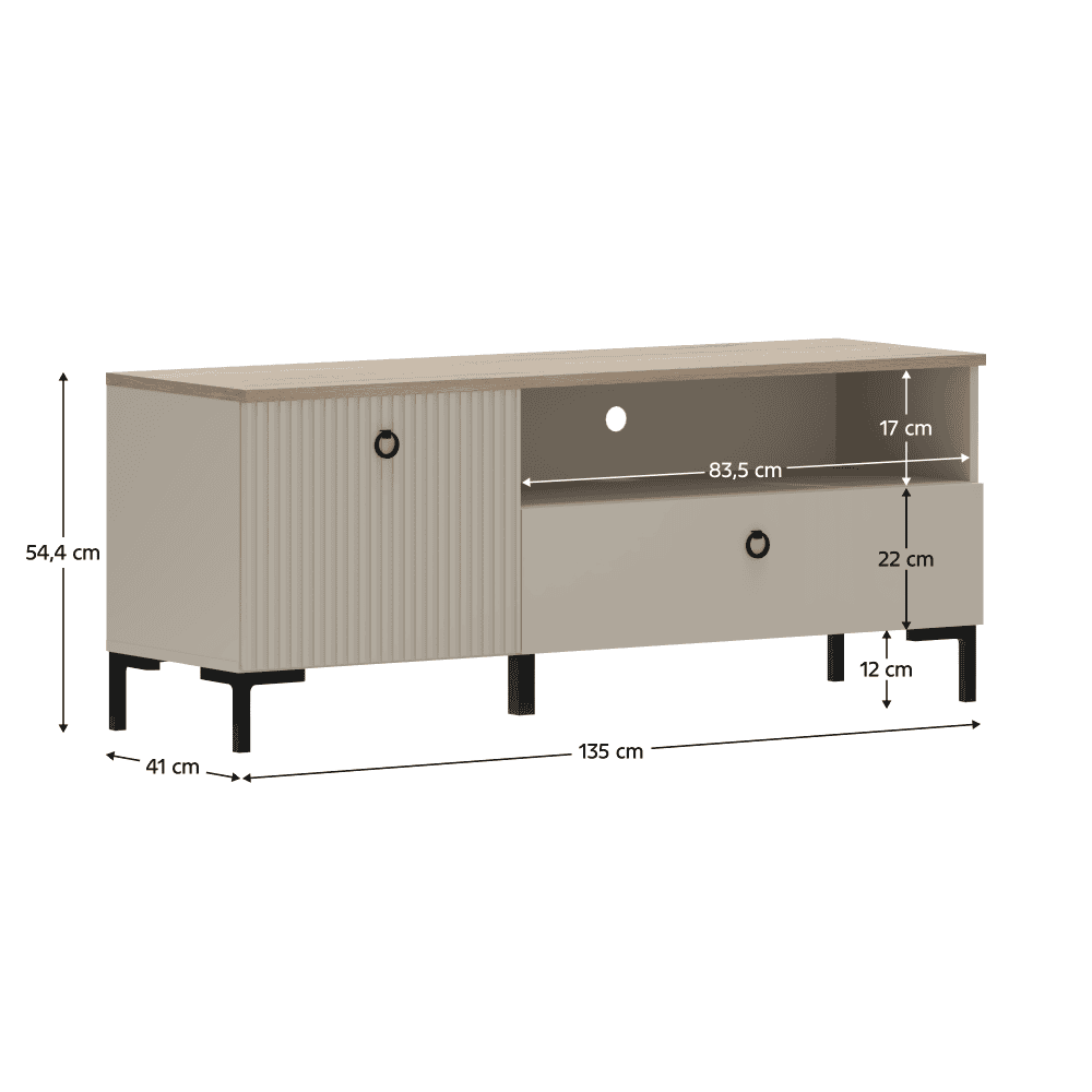Material: MDF laminat DTD/înfoliat Culoare: gri-maroniu Taupe/stejar silverjack Dimensiuni (lxAxh): 135x41x54,4 cm Grosimea materialului DTD: 1,6-1,8 cm Grosimea materialului MDF: 1,9 cm Uşă simplă Spaţiu de depozitare deschis Un sertar Portanţa blatului superior: 10 kg Portanţa poliţei: 5 kg Portanţă sertar: 3 kg Orificiu de ieşire pentru cabluri Cu mânere Material mâner: metal Culoare mâner: negru mat Pe picioare Înălţimea picioarelor: 12 cm Material picior: plastic Culoare picior: negru mat Uşi decorative frezate Design modern Recomandăm fixarea pe perete Livrat dezasamblat