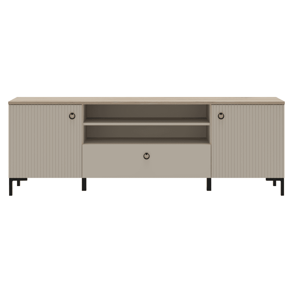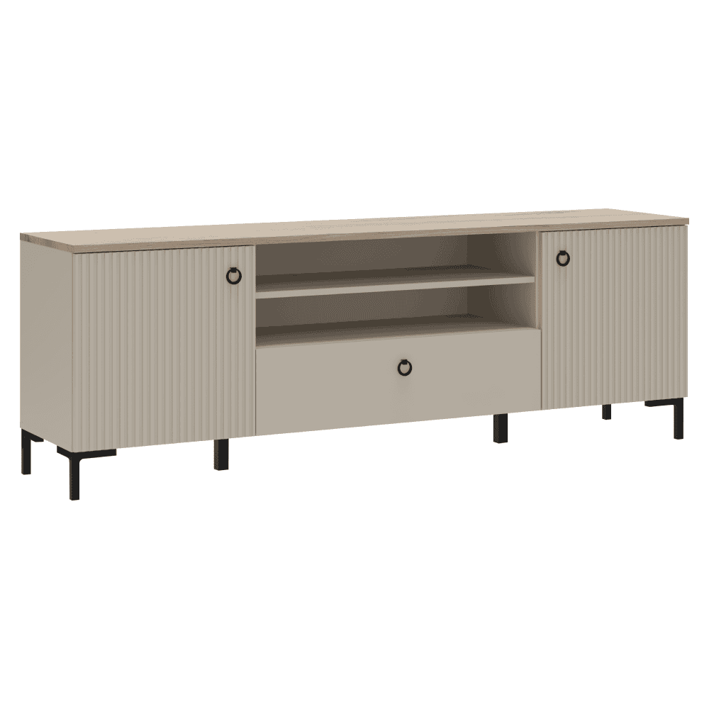 Material: MDF laminat DTD/înfoliat Culoare: gri-maroniu Taupe/stejar silverjack Dimensiuni (lxAxh): 183,9×62,9×41 cm Grosimea materialului DTD: 1,6-1,8 cm Grosimea materialului MDF: 1,9 cm Cu două uşi Spaţiu de depozitare deschis Poliţă Un sertar Portanţa blatului superior: 10 kg Portanţa poliţei: 5 kg Portanţă sertar: 3 kg Orificiu de ieşire pentru cabluri Cu mânere Material mâner: metal Culoare mâner: negru mat Pe picioare Înălţimea picioarelor: 12 cm Material picior: plastic Culoare picior: negru mat Uşi decorative frezate Design modern Recomandăm fixarea pe perete Livrat dezasamblat
