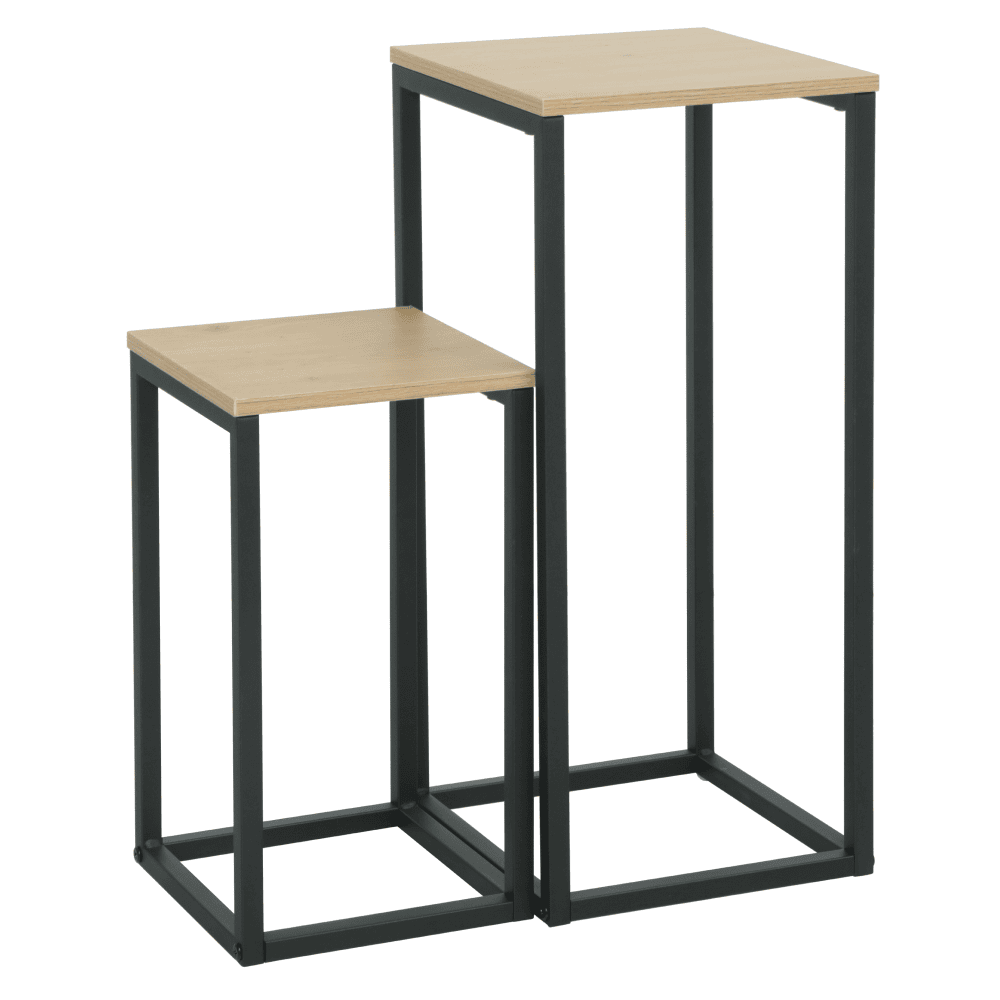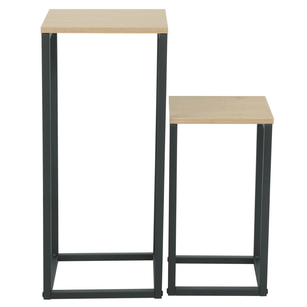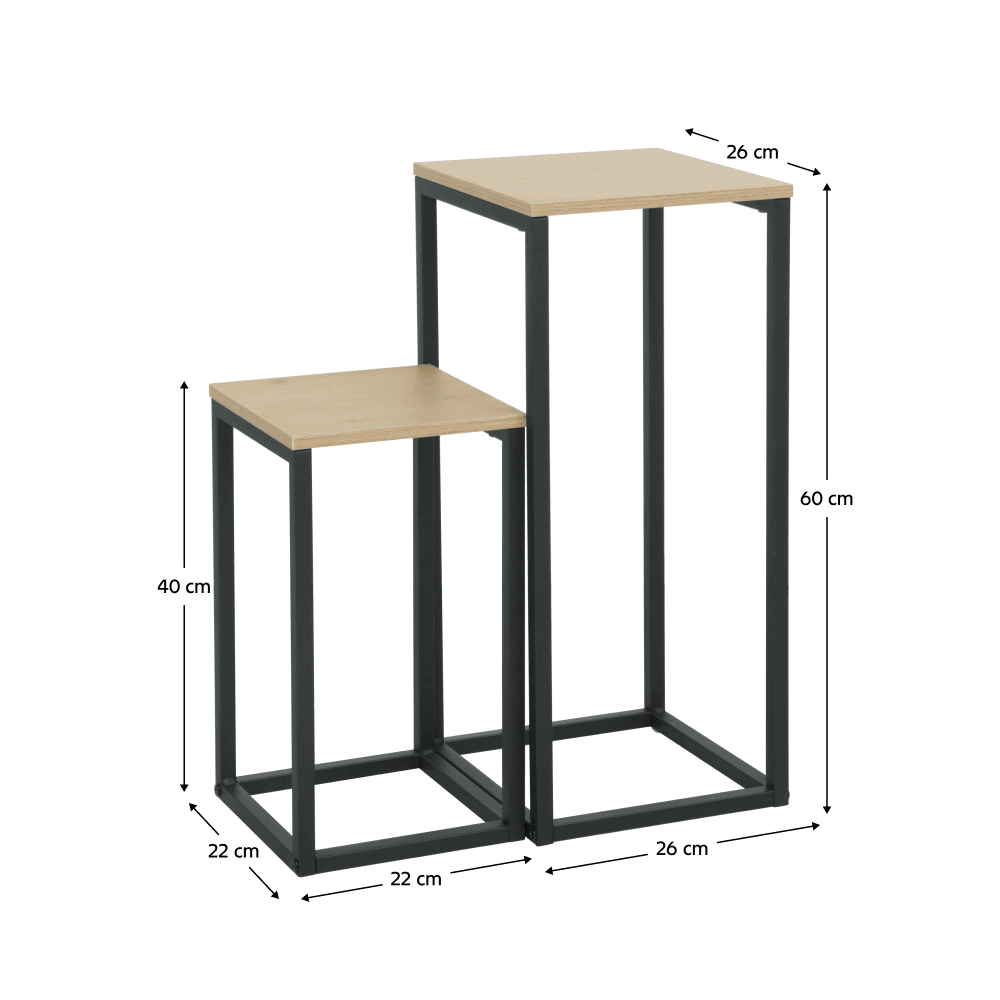 Material: placă PB melaminată/metal Culoare: stejar/negru Dimensiunile măsuţei mai mari (lxAxh): 26x26x60 cm Dimensiunile mesei mai mic (lxAxh): 22x22x40 cm Grosimea materialului plăcii PB: 1,2 cm Portanţă: 20 kg Set de 2 bucăţi Modern şi elegant Livrat dezasamblat