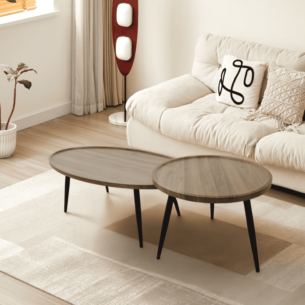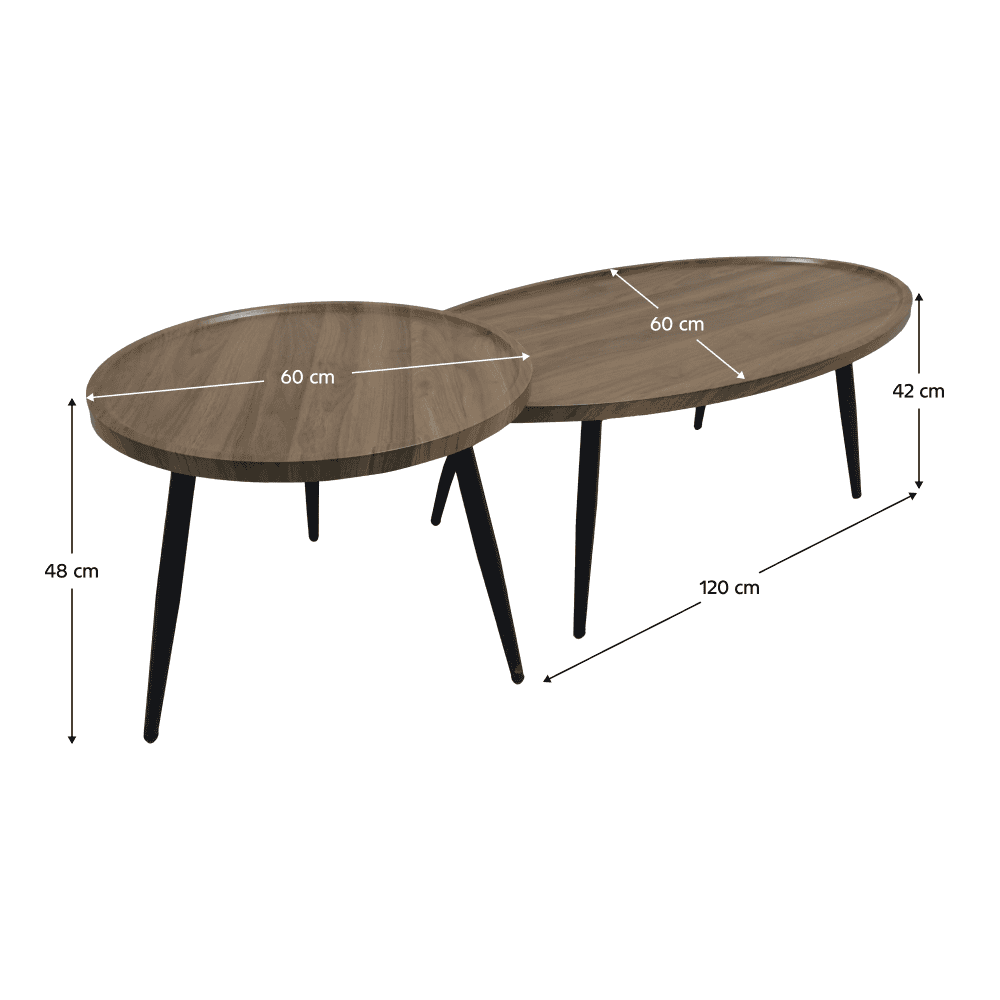 Material: MDF înfoliat/metal Culoare: stejar/negru Dimensiunile mesei mai mari (lxAxh): 120x60x42 cm Dimensiunile mesei mai mic (Dxh): 60×48 cm Grosimea blatului de masă: 2,5 cm Set de 2 bucăţi Posibilitatea de a împinge măsuţa mai mică sub măsuţa mai mare Rotund Modern şi elegant Portanţă: 25 kg Stil industrial Livrat dezasamblat