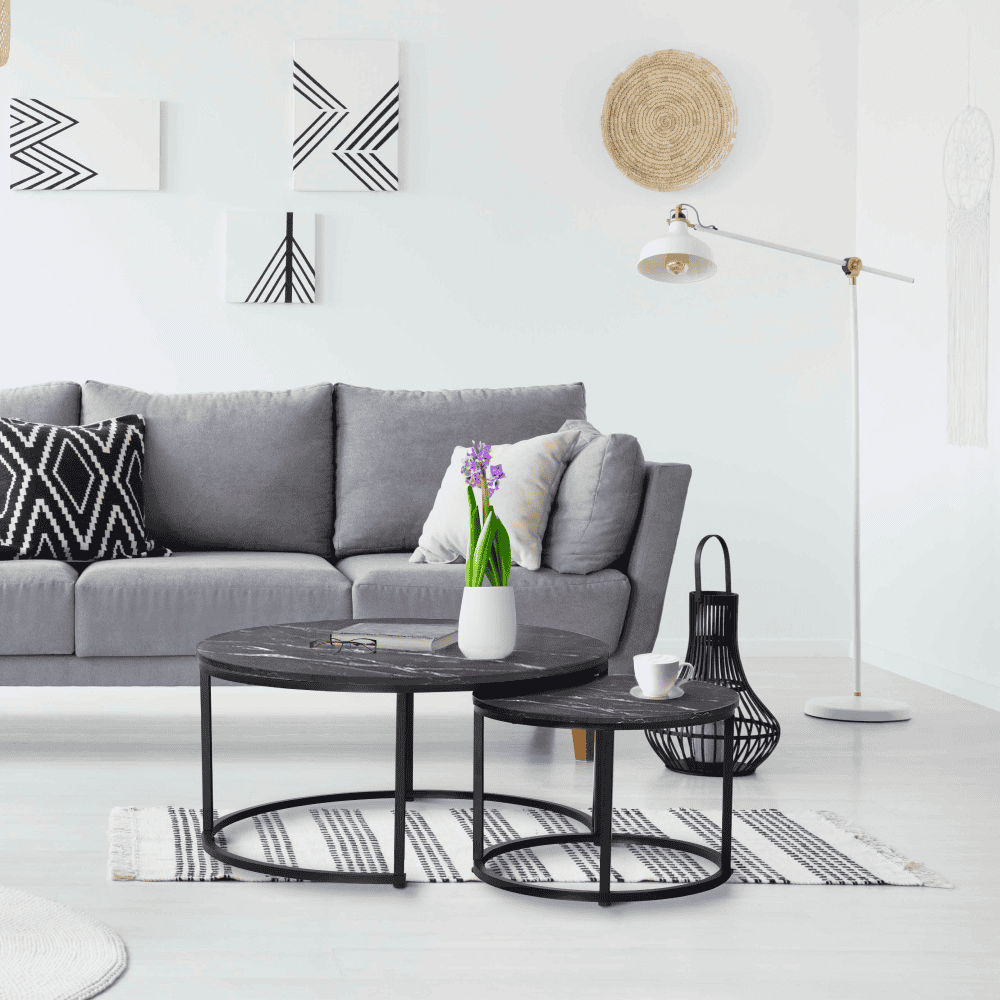 Material: DTD laminat/metal Culoare: negru/gri închis Masă mai mare (diametru x h): 80×48 cm Masă mai mică (diametru x h): 48×42 cm Grosime material: 1,5 cm Portanţă: 40 kg Set de două mese Posibilitate a împinge masa mai mică sub cea mai mare Rotund Modern Livrat dezasamblat