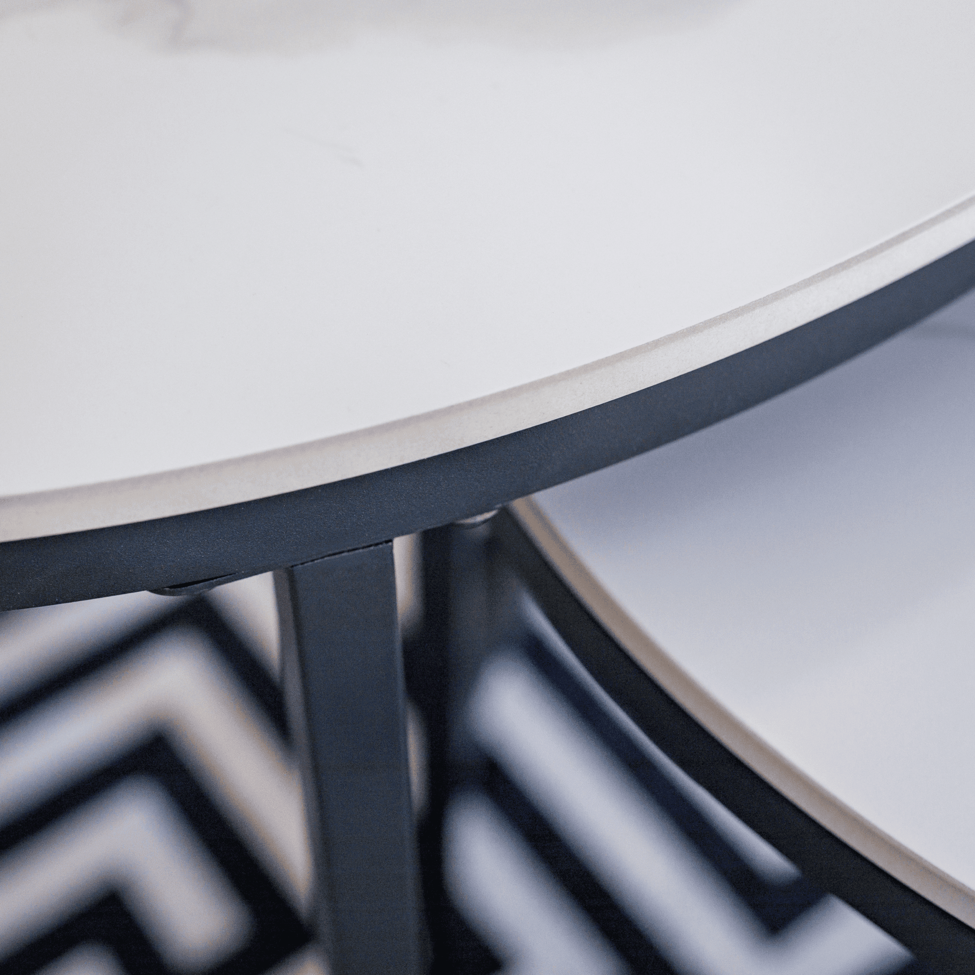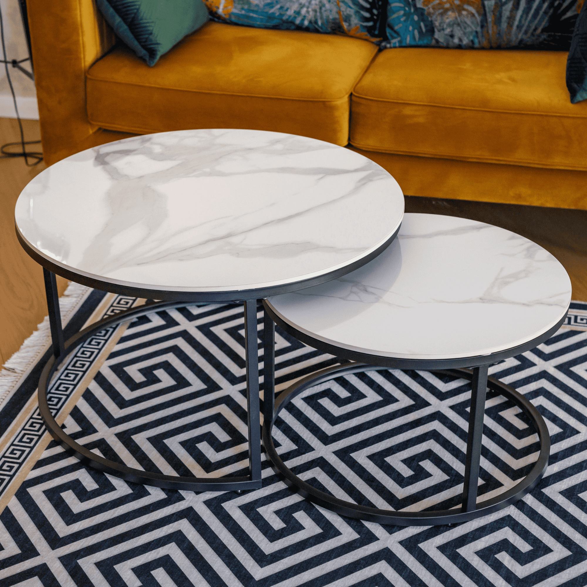Material blat de masă: piatră şlefuită Culoare: marmură albă Construcţie picior: oţel Culoare: negru Dimensiunile mesei mai mari (Hxl): 80×43 cm Dimensiunile mesei mai mici (Hxl): 60×37 cm Grosimea blatului de masă: 1,1 cm Set de 2 bucăţi Rotund Modern şi elegant Portanţă 30 kg Livrate dezasamblate