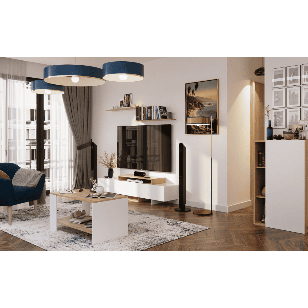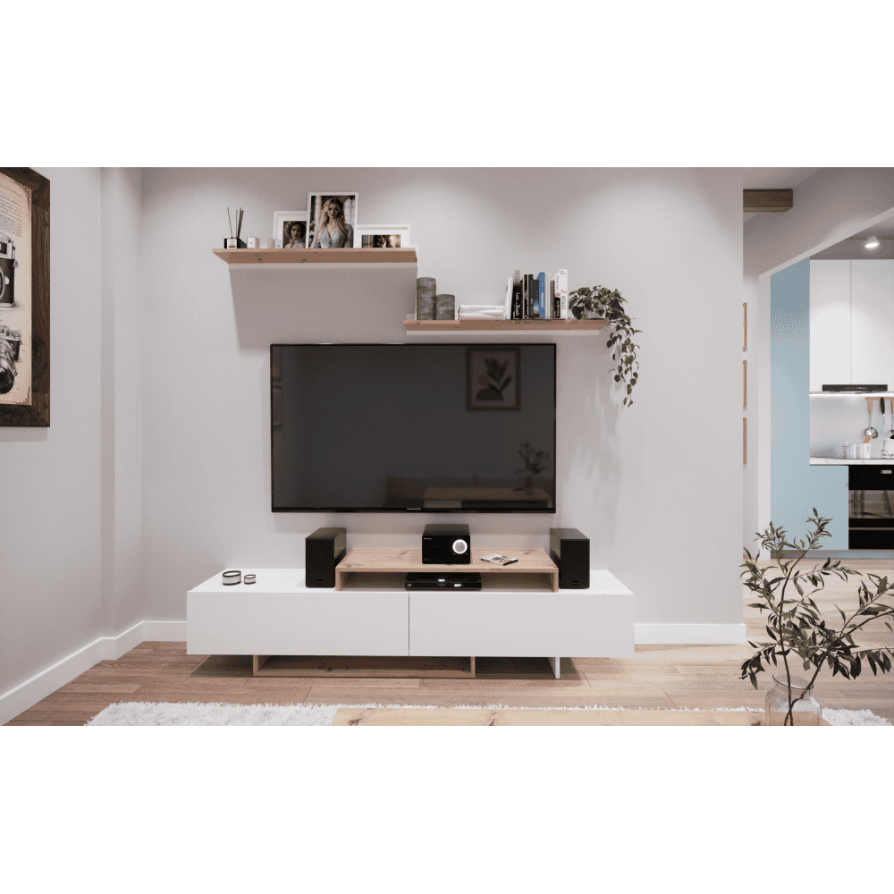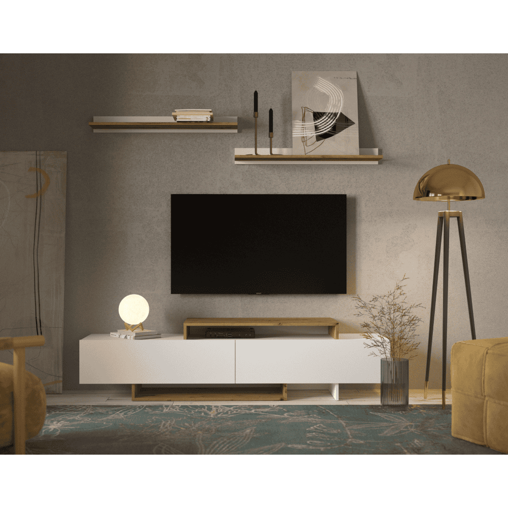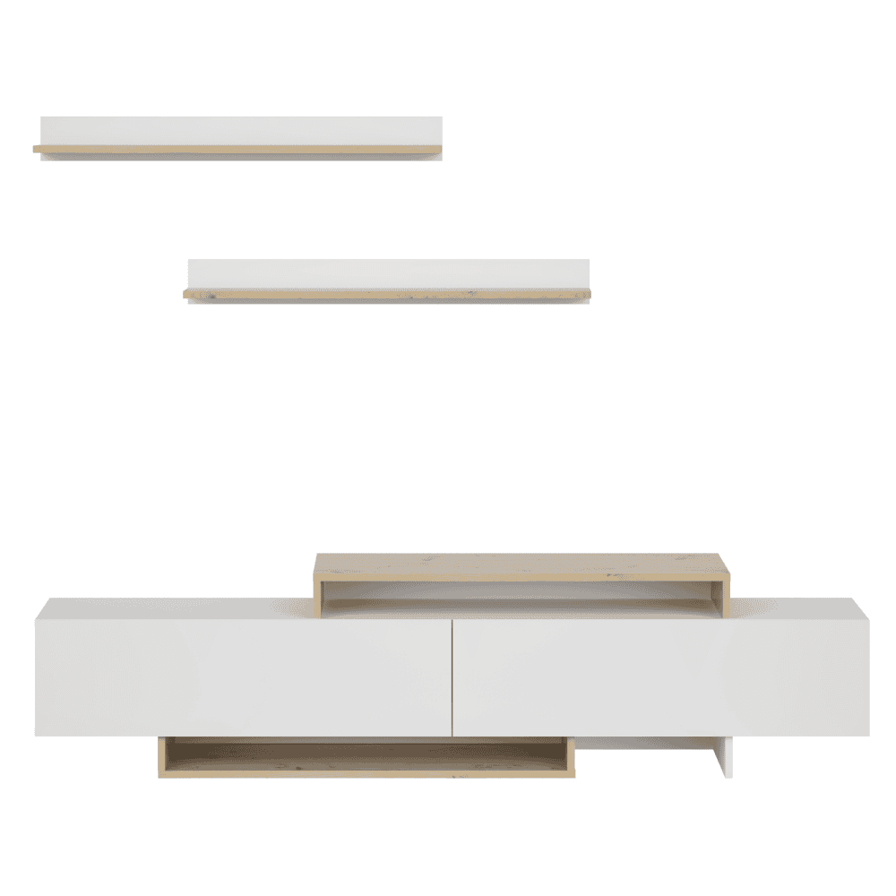 Material: DTD laminat Culoare: albă/stejar artisan Dimensiuni (lxAxh): 180x35x50 cm Grosime material DTD: 1,6 cm Măsuţă TV 2x poliţă suspendată Dimensiuni poliţă (lxAxh): 90×16,6×10 cm Portanţa poliţei suspendate: 3 kg Spaţiu de depozitare deschis 2x dulap basculant Portanţa a dulapului basculant: 7 kg Portanţă placă superioară: 10 kg Margine: hârtie acoperită cu polimeri termoreactivi Grosime DTD partea din spate: 0,3 cm Culoare partea din spate: albă Balamale Design modern Recomandăm ataşarea de perete Livrat dezasamblat