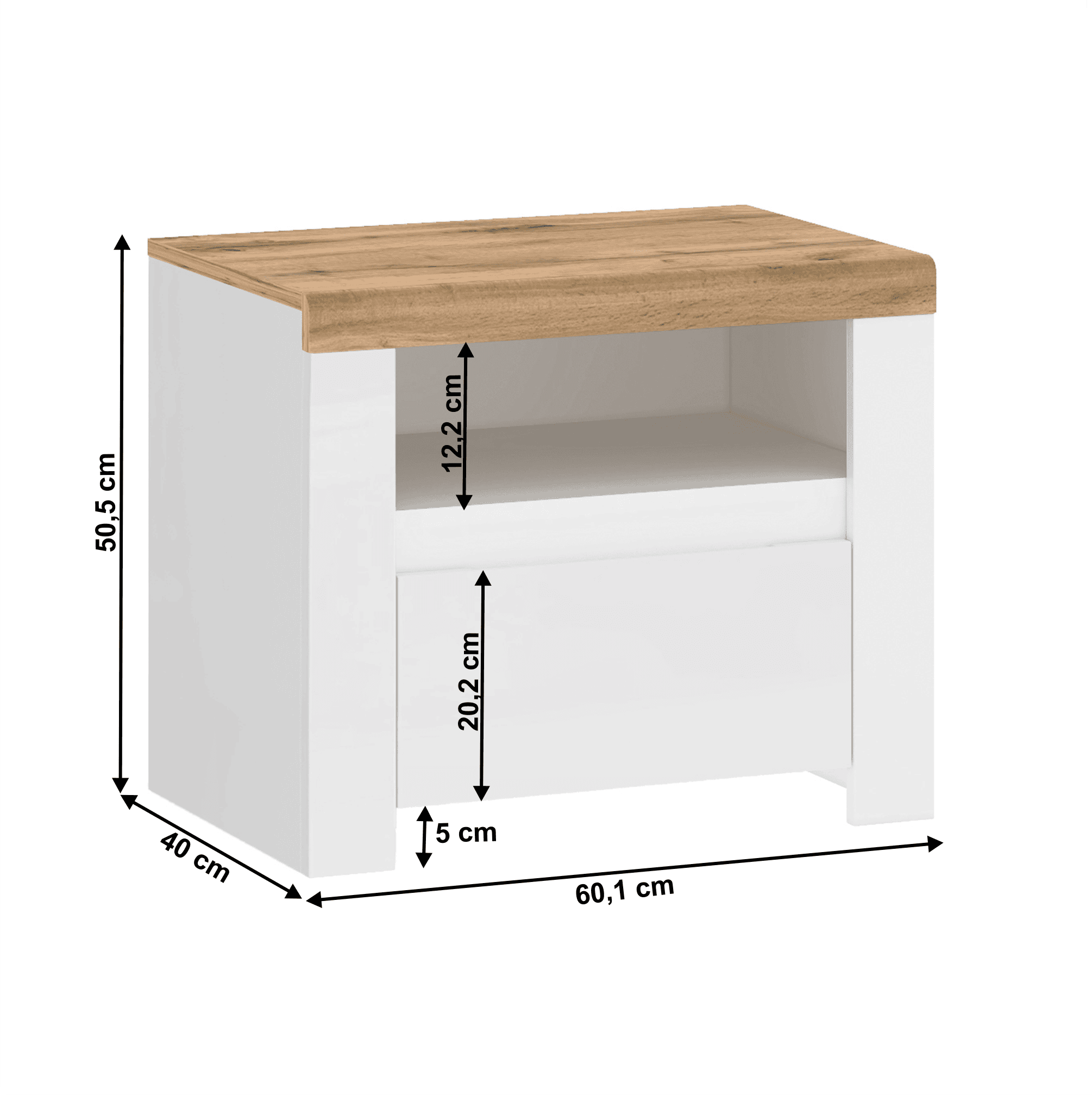 Material: DTD laminat/ canturi ABS/ MDF Culoare: alb foarte lucios/ stejar wotan Dimensiuni (LxAxÎ): 60,1x40x50,5 cm Înălţimea spaţiului inferior de la podea: 5 cm Grosimea materialului: 1,6 până la 2,2 cm Uşă din MDF Cu un sertar şi o zonă de depozitare deschisă Înălţime sertar: 20,2 cm Înălţimea spaţiului de depozitare deschis: 12,2 cm Deschidere/închidere cu o decupare Livrată dezasamblată