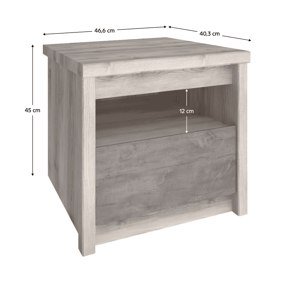 Material: PAL melaminat Culoare: castan Nairobi / onix Dimensiuni (LxAxÎ): 46,6x45x40,3 cm Grosime material: 1,6-3,2 cm Mânere metalice Culoare mânere: neagră Zonă de depozitare deschisă Înălţimea zonei de depozitare: 12 cm Cu sertar Capacitatea sertarului: 3 kg Picioare de plastic Design modern Livrată dezasamblată