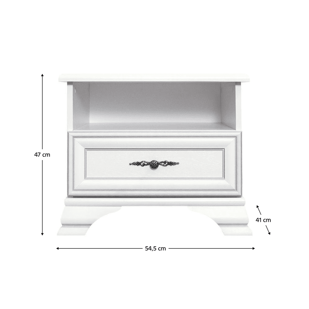 Material: DTD laminat Culoare: alb alpin Dimensiuni (lxAxh): 54,5x41x47 cm Grosime material: 1,6 cm Mânere metalice Culoarea mânerelor argint antic Sertar Portanţă sertar: 3 kg Spaţiu de depozitare deschis Pe picioare Înălţimea picioarelor: 8 cm Livrat dezasamblat