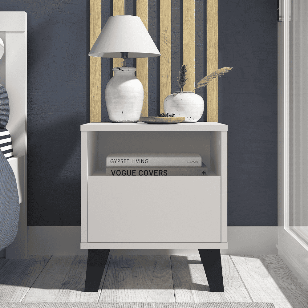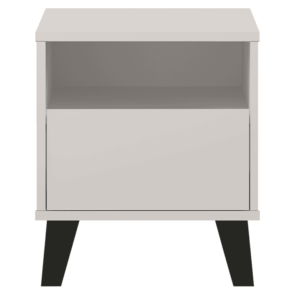 Material: DTD laminat Culoare: caşmir Dimensiuni (Lxlxh): 40×38,8×45,6 cm Înălţimea spaţiului inferior de la podea: 12 cm 1 sertar Dimensiunea sertarului (Lxh): 36,2×18 cm Compartiment de depozitare deschis Înălţimea compartimentului de depozitare deschis: 12,4 cm Pe picioare Culoare picior: negru Portanţa sertarului şi poliţei: 5 kg Portanţa plăcii superioare: 15 kg Design modern Fără mânere Vă recomandăm să ataşaţi mobilierul de perete Livrat dezasamblat