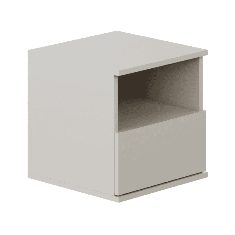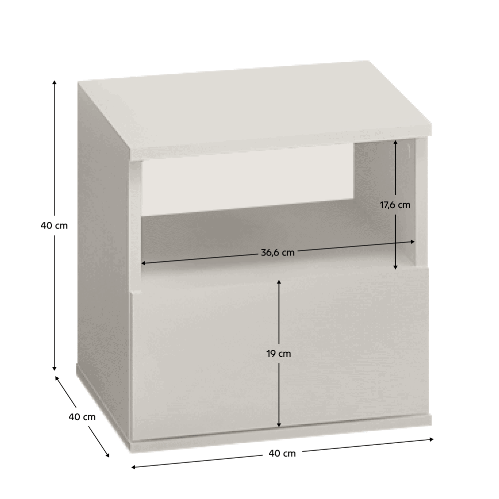 Material: DTD laminat Culoare: caşmir Dimensiuni (Lxlxh): 40x40x40 cm Grosime DTD laminat: 1,6 cm Sertar Înălţime sertar: 19 cm Portanţă sertar: 5 kg Zonă de depozitare deschisă Înălţimea zonei de depozitare deschise: 17,6 cm Picioare din plastic – glisoare Portanţă: 10 kg Glisoare Design modern Produs slovac de calitate Livrat dezasamblat