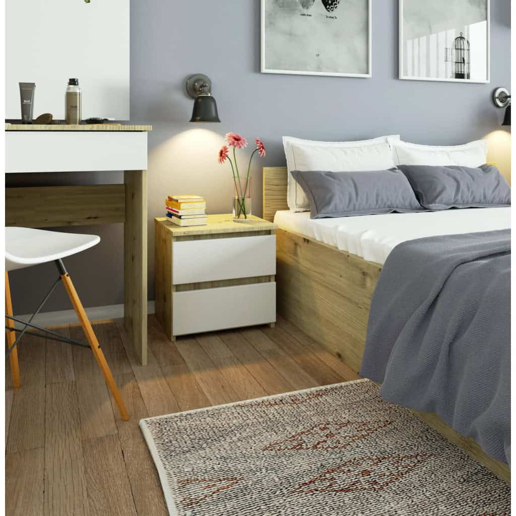 Noptiera cu 2 sertare, din PAL laminat, 40x35x40 cm, stejar artisan si alb Mob360