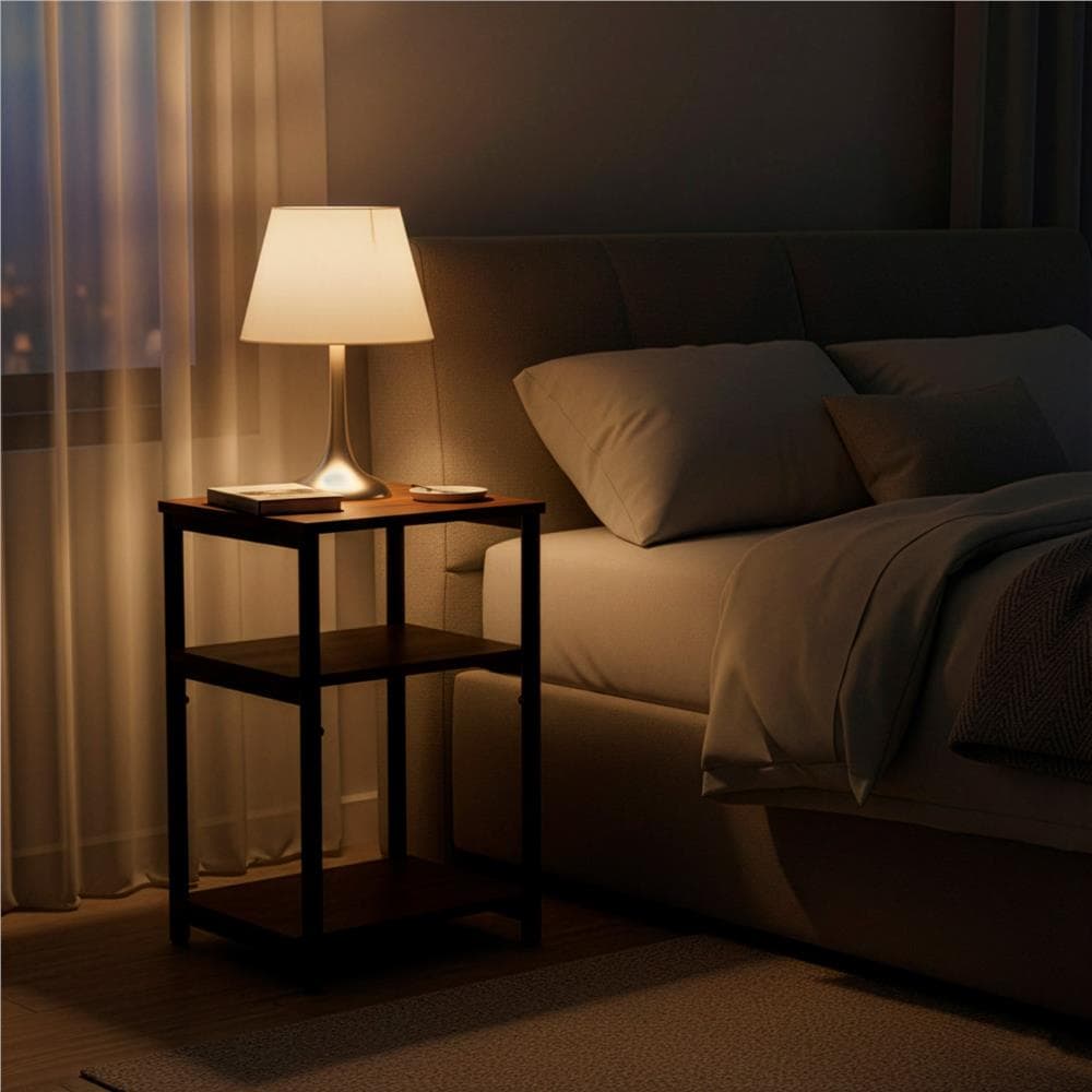 Specificatii tehnice: Material: metal, placa PAL Culoare: maro inchis, negru Numar rafturi: 3 Sarcina maxima totala: 30 kg Sarcina maxima per raft: 10 kg Inaltime totala: 59 cm Latime totala: 35 cm Adancime totala: 31 cm Grosime rafturi: 1,5 cm Scurta descriere: Noptiera compacta cu 3 rafturi, ideala pentru organizarea obiectelor esentiale langa pat. Constructia metalica ofera stabilitate, iar rafturile din PAL sunt potrivite pentru carti, lampa, telefon sau accesorii personale. Caracteristici principale: Design industrial modern Structura metalica stabila Rafturi rezistente din PAL Dimensiuni compacte, ideale pentru dormitor Picioare reglabile pentru stabilitate sporita Usor de integrat langa pat sau canapea