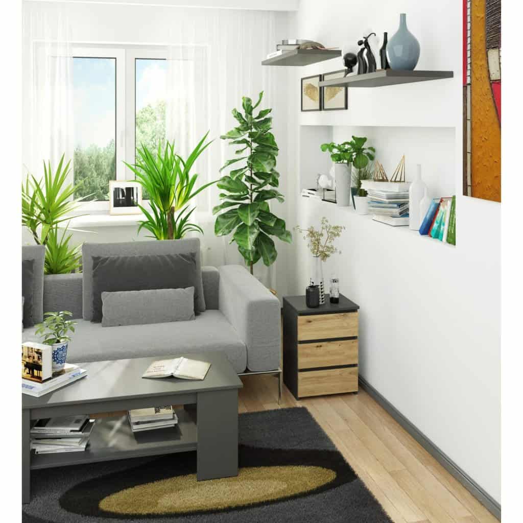 Specificatii tehnice Tip produs: Comoda / Noptiera Colectie: CLP Numar sertare: 3 Material: PAL laminat 16 mm Finisaj: Mat Culoare: Grafit / Stejar Artisan Sistem de glisare: Metalic, bile Margini: ABS, rezistente la uzura Dimensiuni: 40x35x57 cm Adancime sertar: 30 cm Latime sertar: 31 cm Scurta descriere Comoda compacta cu 3 sertare, in combinatia moderna de grafit si stejar artisan, realizata din PAL laminat rezistent la uzura. Designul sau elegant si versatil o face ideala ca noptiera sau spatiu suplimentar de depozitare in dormitor ori birou. Caracteristici principale Structura solida din PAL laminat de 16 mm rezistent la zgarieturi Margini protejate cu ABS pentru durabilitate sporita Trei sertare incapatoare cu sistem de glisare metalic Design elegant in culori contrastante grafit si stejar artisan Versatila, potrivita pentru dormitor, living sau camera copilului Montaj simplu, cu instructiuni clare incluse