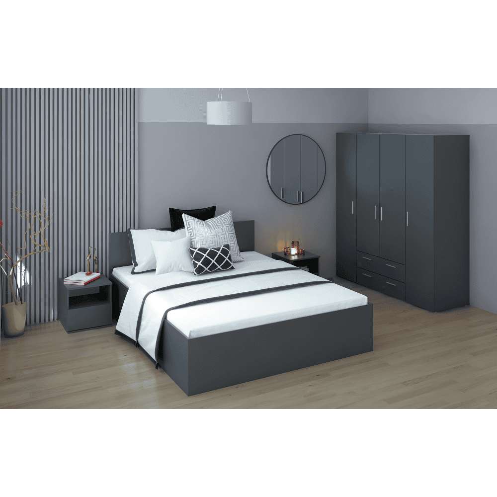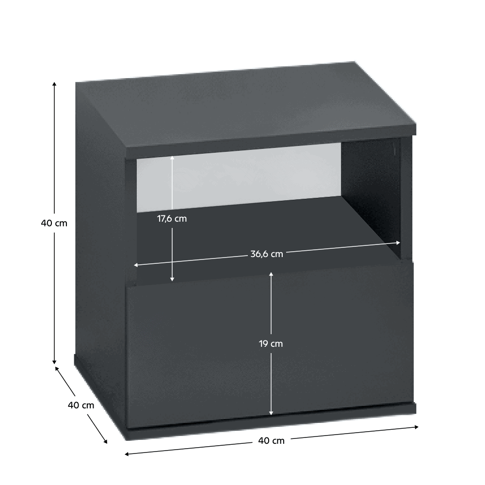Material: DTD laminat Culoare: grafit Dimensiuni (Lxlxh): 40x40x40 cm Grosime DTD laminat: 1,6 cm Sertar Înălţime sertar: 19 cm Portanţă sertar: 5 kg Zonă de depozitare deschisă Înălţimea zonei de depozitare deschise: 17,6 cm Picioare din plastic – glisoare Portanţă: 10 kg Glisoare Design modern Produs slovac de calitate Livrat dezasamblat
