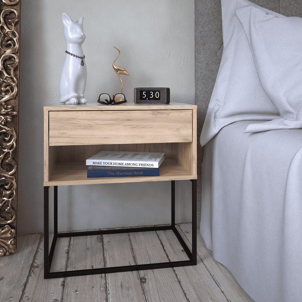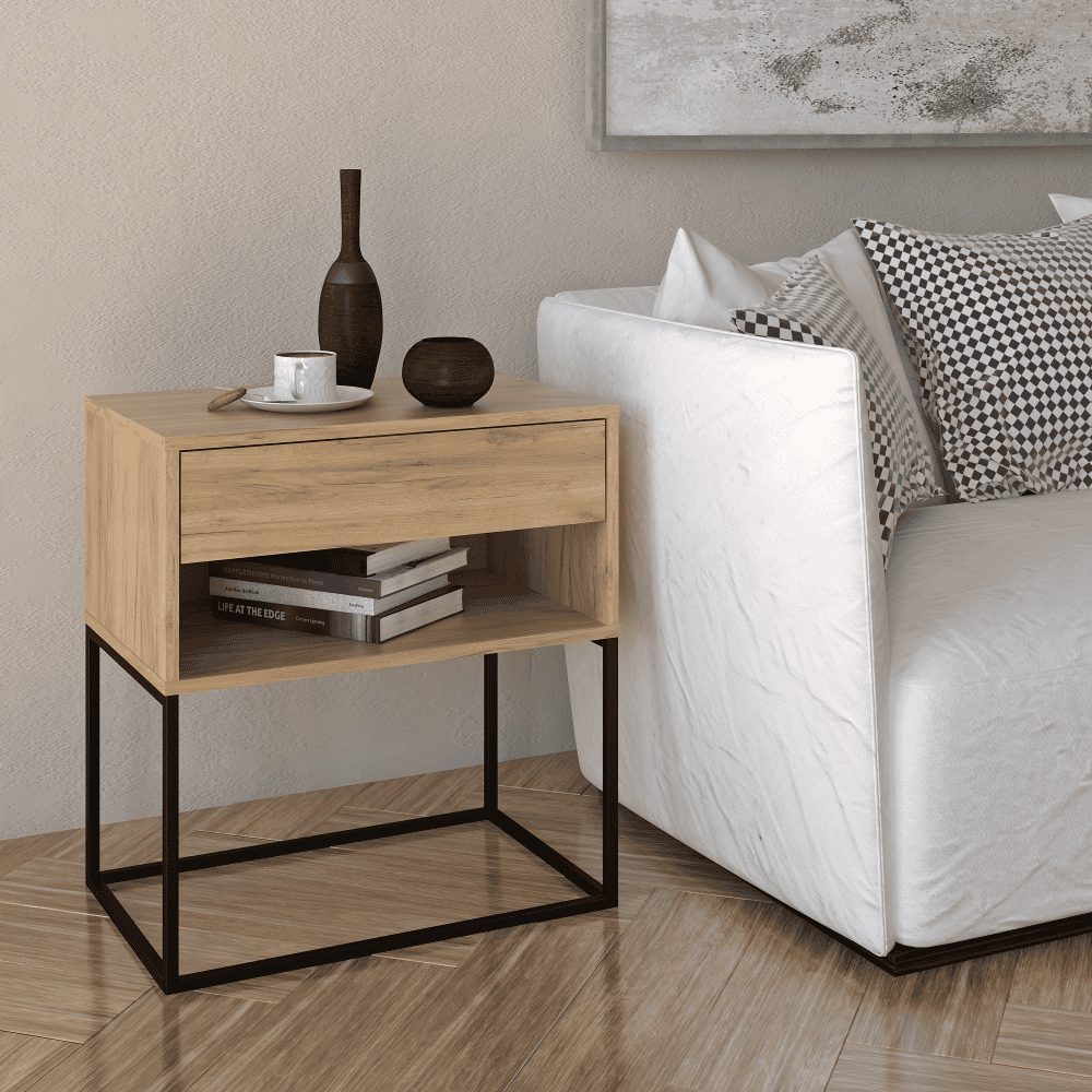 Material: DTD laminat/metal Culoare: stejar/artisan/neagră Dimensiuni (lxAxh): 60×38,4×65 cm Grosime material: 1,6 cm Spaţiu de depozitare deschis Dimensiunea spaţiului de depozitare deschis (lxh): 56,6×13,5 cm Un sertar Înălţime sertar: 13 cm Baza metalica Înălţimea bazei: 35 cm Noptieră Măsuţă ajutătoare Portanţă: 10 kg Portanţă sertar: 5 kg Vă recomandăm să ataşaţi mobilierul de perete Produs slovac de calitate Livrat dezasamblat