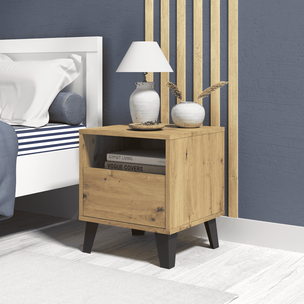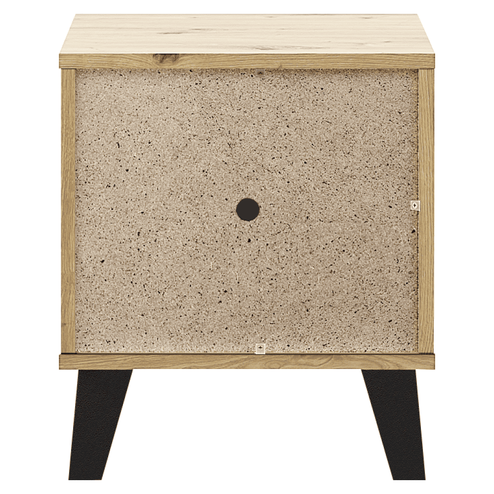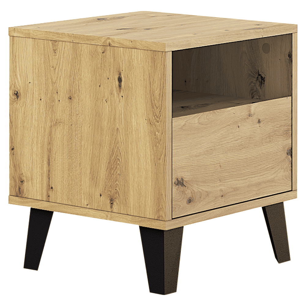 Material: DTD laminat Culoare: stejar artisan Dimensiuni (Lxlxh): 40×38,8×45,6 cm Înălţimea spaţiului inferior de la podea: 12 cm 1 sertar Dimensiunea sertarului (Lxh): 36,2×18 cm Compartiment de depozitare deschis Înălţimea compartimentului de depozitare deschis: 12,4 cm Pe picioare Culoare picior: negru Portanţa sertarului şi poliţei: 5 kg Portanţa plăcii superioare: 15 kg Design modern Fără mânere Vă recomandăm să ataşaţi mobilierul de perete Livrat dezasamblat