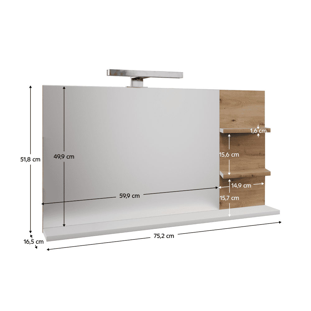 Material: DTD laminat/sticlă Culoare: albă/stejar artisan Dimensiuni (lxAxh): 75,2×16,5×51,8 cm Dimensiuni oglindă (lxh): 59,9×49,9 cm Grosime material: 1,6 cm Spaţiu de depozitare deschis Cu poliţă Lăţime poliţă: 14,9 cm Portanţă poliţă: 5 kg Cu ??iluminare LED Culoare iluminare LED: alb rece Recomandat pentru fixare pe perete Design modern Livrat dezasamblat