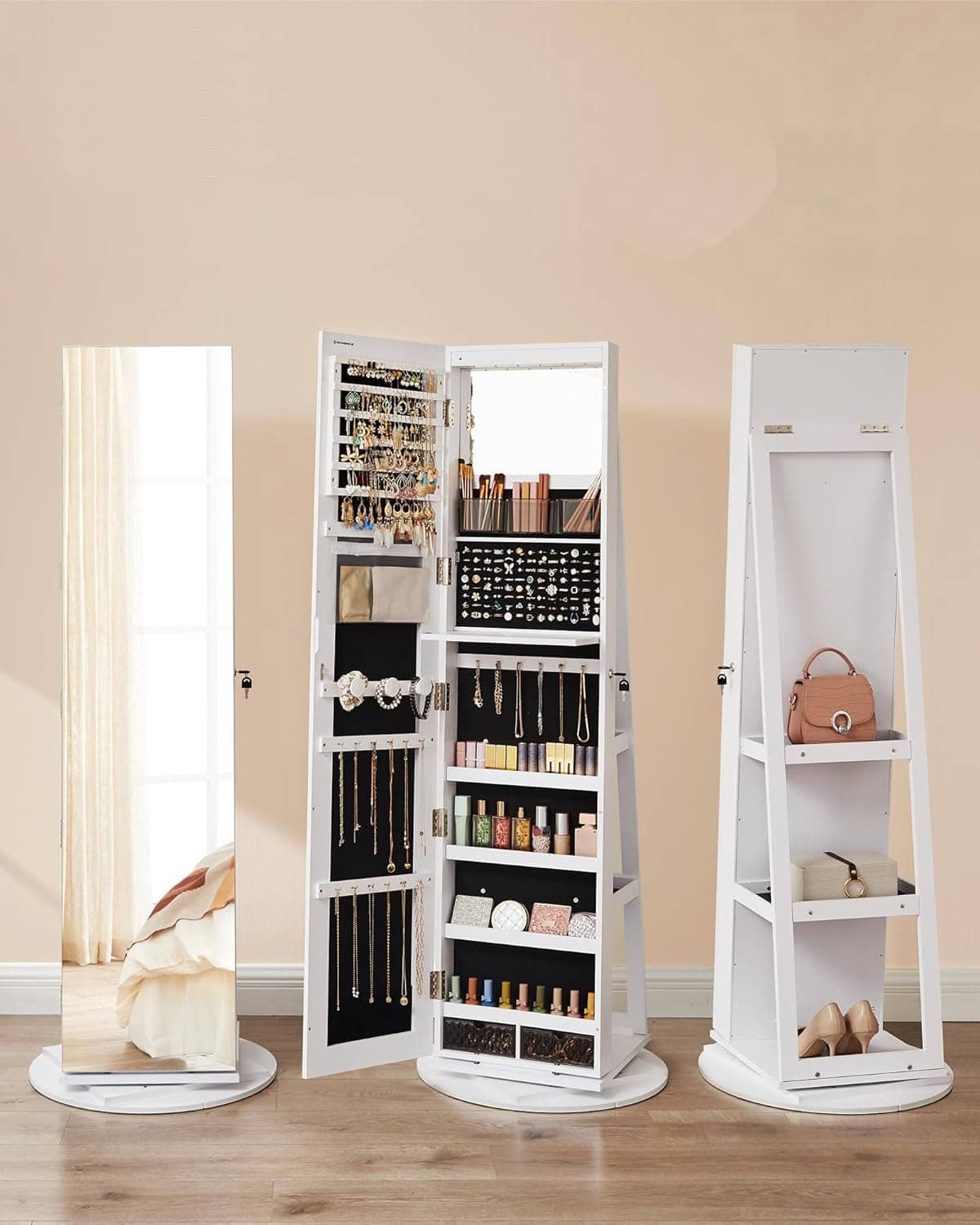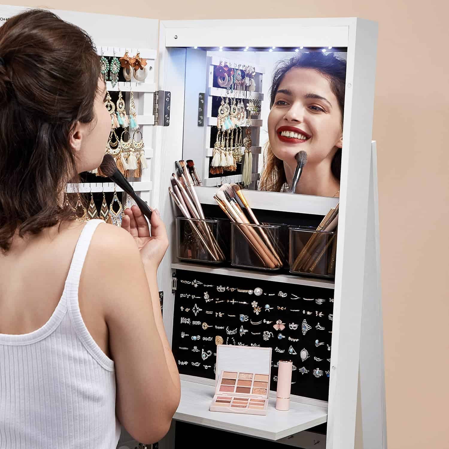 Caracteristici: Culoare: Alb Materiale: MDF, panou, sticla, lemn: Panou MDF, otel, catifea, sticla Dimensiuni totale: 54.5 x 54.5 x 162 cm (L x l x H) Dimensiuni dulap de depozitare: 37 x 9,5 x 155 cm (L x l x i)I Dimensiunile oglinzii laterale: 35,5 x 24 cm (L x l) Note: Copiilor le este interzis sa calareasca si sa se joace cu ele. Despre acest articol Oglinda frumoasa: Acest dulap de bijuterii are o oglinda pe toata lungimea fara rama de 37 x 155 cm, astfel incat sa va puteti admira tinuta de sus pana jos in oglinda. Incepeti fiecare zi cu un look frumos! Spatiu de depozitare suficient: 120 de sloturi pentru cercei, 54 de gauri pentru cercei cu buton, 91 de sloturi pentru inele, 18 carlige pentru lanturi si 3 bare pentru bratari. Exista, de asemenea, 3 compartimente, 2 sertare, 4 rafturi si o punga – astfel incat sa nu mai existe dezordine. Oglinda interioara cu iluminare: Acest dulap de bijuterii are o oglinda interioara cu 6 lumini LED, astfel incat sa puteti alege rapid bijuteriile potrivite sau sa va uitati cu precizie la machiaj. Machiaj usor: O oglinda interioara si un raft cu balamale pentru machiaj – creand o mini masa de toaleta care va permite sa va machiati atunci cand usa dulapului se deschide. Solid si protejat: Realizat din cadru MDF solid, sustinut de o baza de 54,6 cm si captusit cu catifea – toate acestea asigura o durata lunga de viata si ofera comorilor dvs. protectie optima.