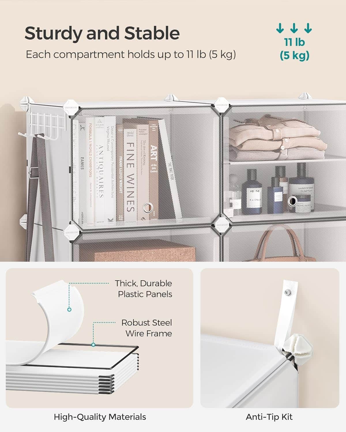 Specificatii tehnice Tip produs: Dulap pantofi modular Material: Plastic PP, conectori ABS, metal Cadru: Otel Culoare: Alb/transparent Numar compartimente: 12 Dimensiuni compartiment: 30x40x30 cm Dimensiuni totale: 124x32x125 cm Capacitate maxima pe compartiment: 5 kg Capacitate maxima totala: 60 kg Scurta descriere Dulapul de pantofi SONGMICS cu 12 compartimente ofera o solutie practica pentru organizarea incaltamintei si a accesoriilor. Structura modulara permite configurarea flexibila, iar usile transparente protejeaza continutul de praf, asigurand in acelasi timp ventilarea. Este potrivit pentru hol, dormitor sau zona de intrare. Caracteristici principale Configuratie modulara cu 12 compartimente spatioase Usi transparente pentru protectie impotriva prafului Structura stabila cu cadru metalic si panouri din plastic Ventilatie integrata pentru prevenirea mirosurilor Posibilitate de configurare in mai multe forme Accesorii incluse pentru montaj si stabilitate sporita