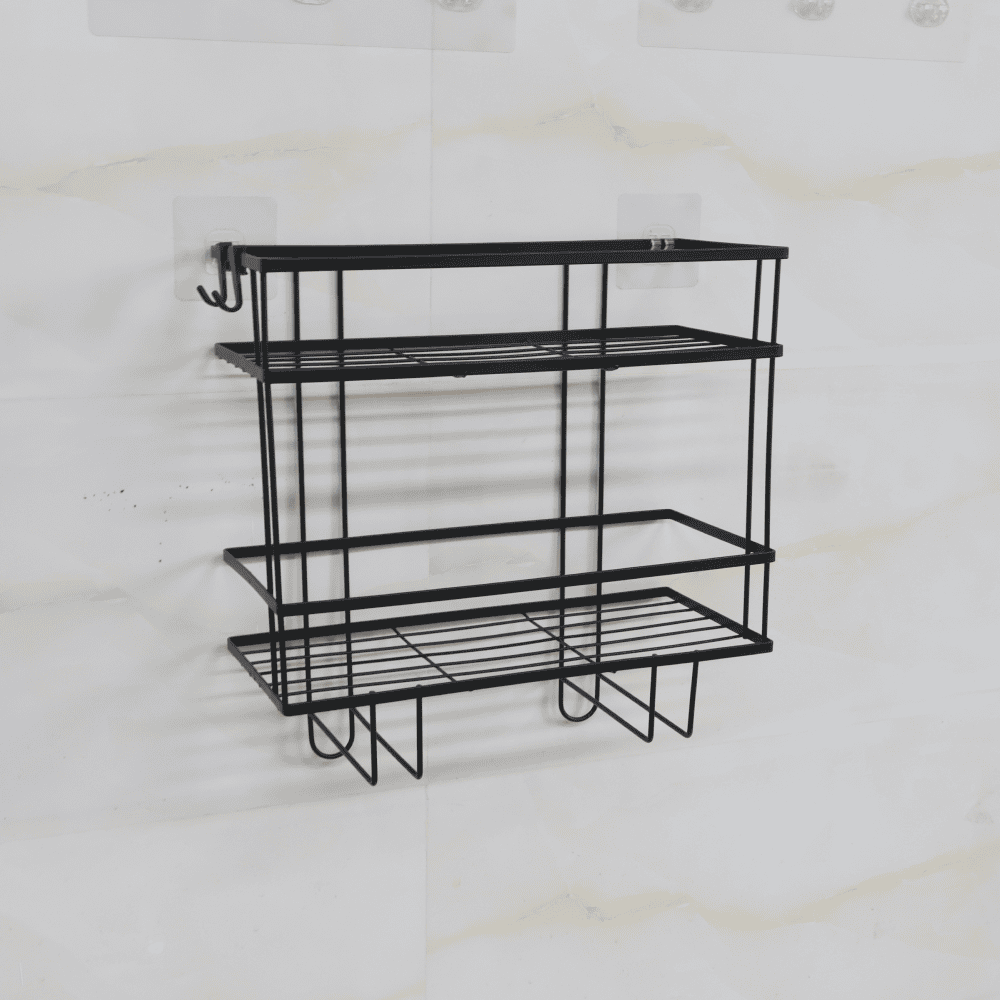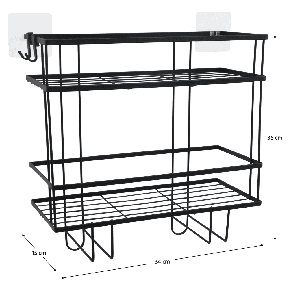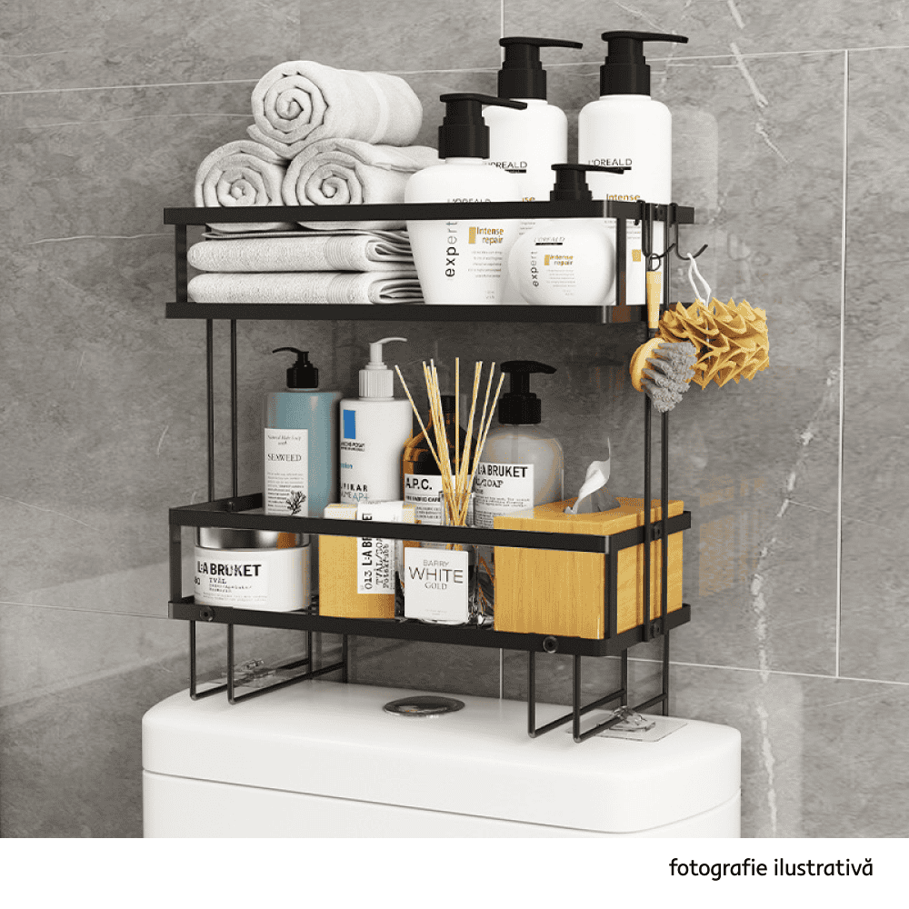 Material: oţel carbon Culoare: negru Dimensiuni (lxAxh): 34x15x36 cm Portanţă: 5 kg Două poliţe Multifuncţional Modern Potrivit deasupra WC-ului Potrivit pentru perete Livrat asamblat