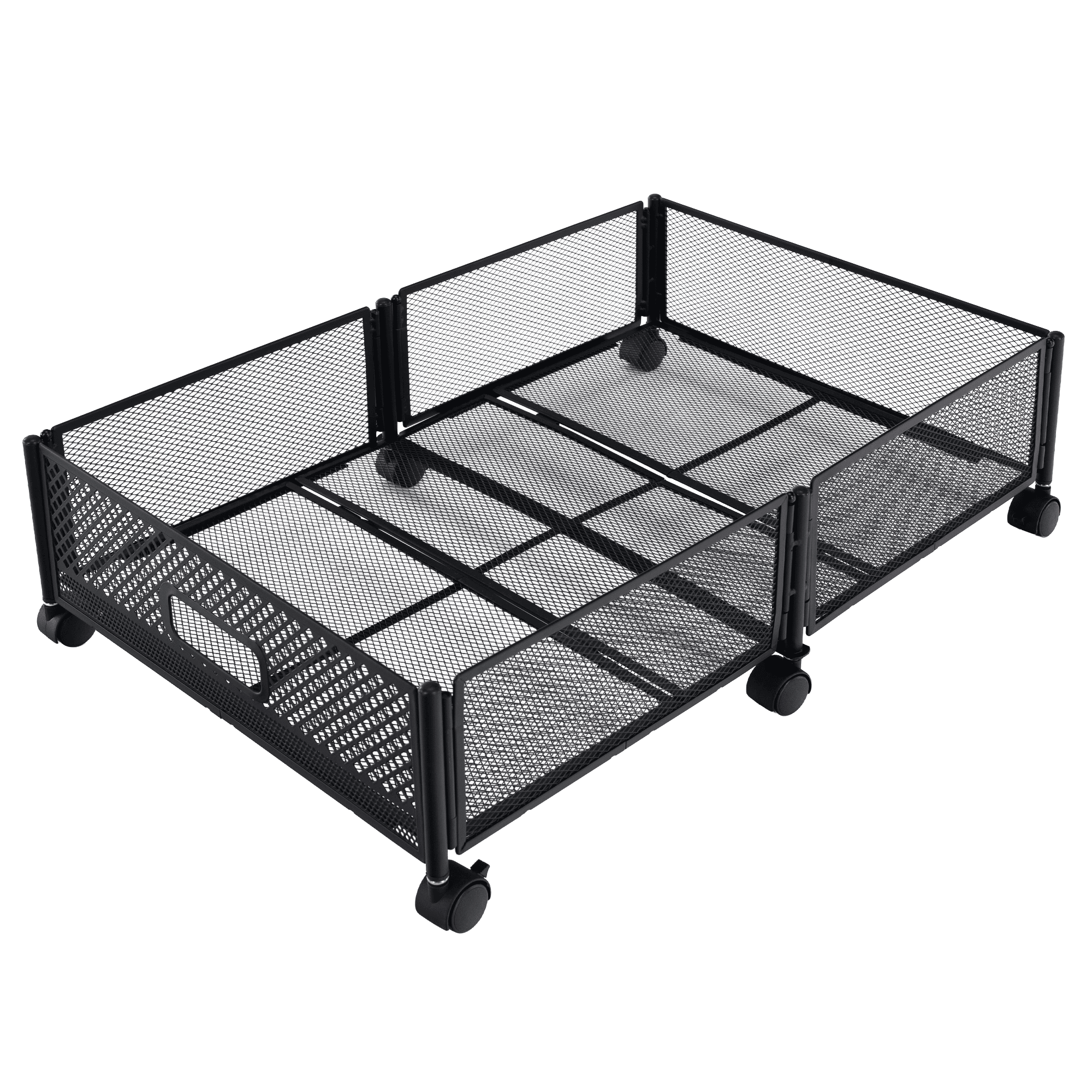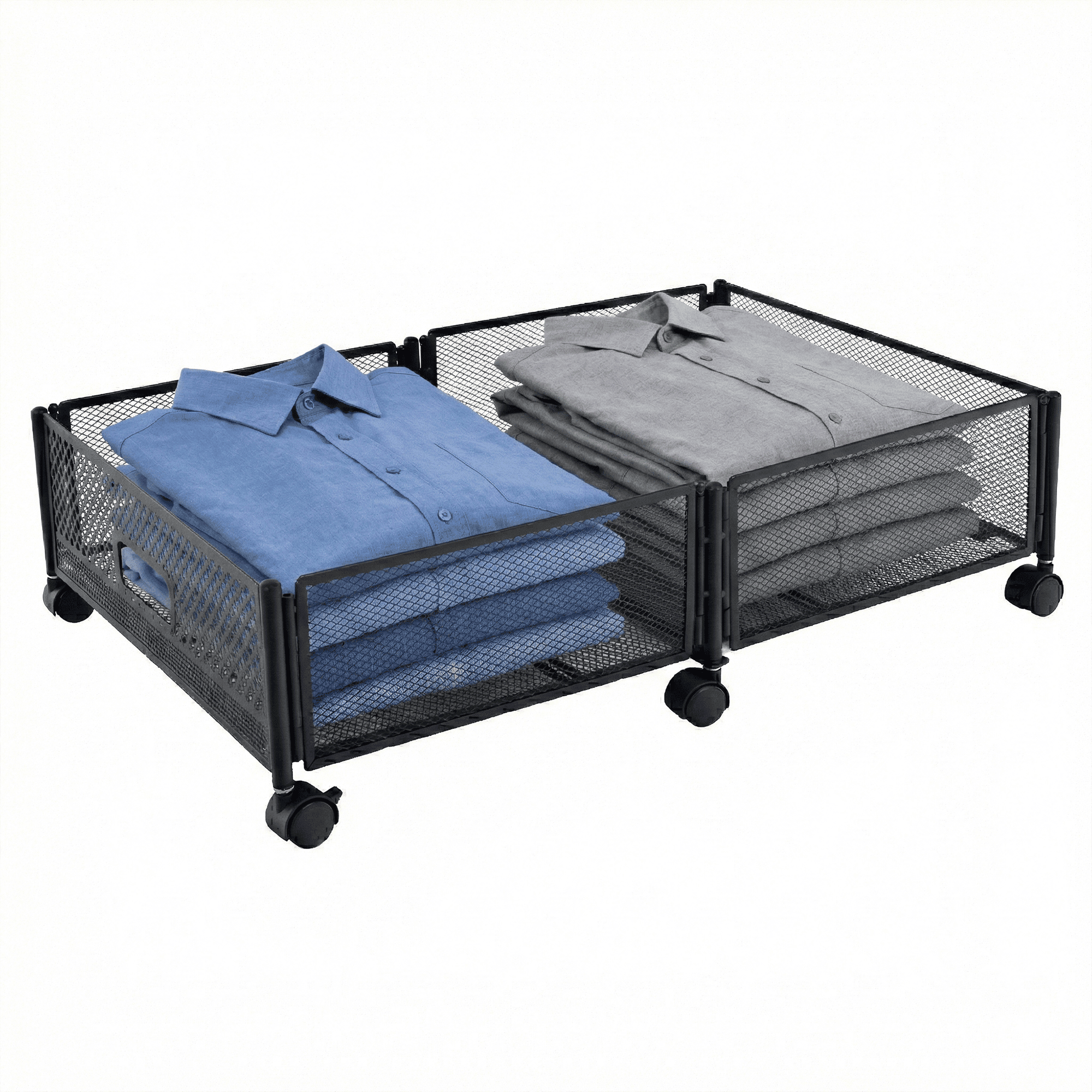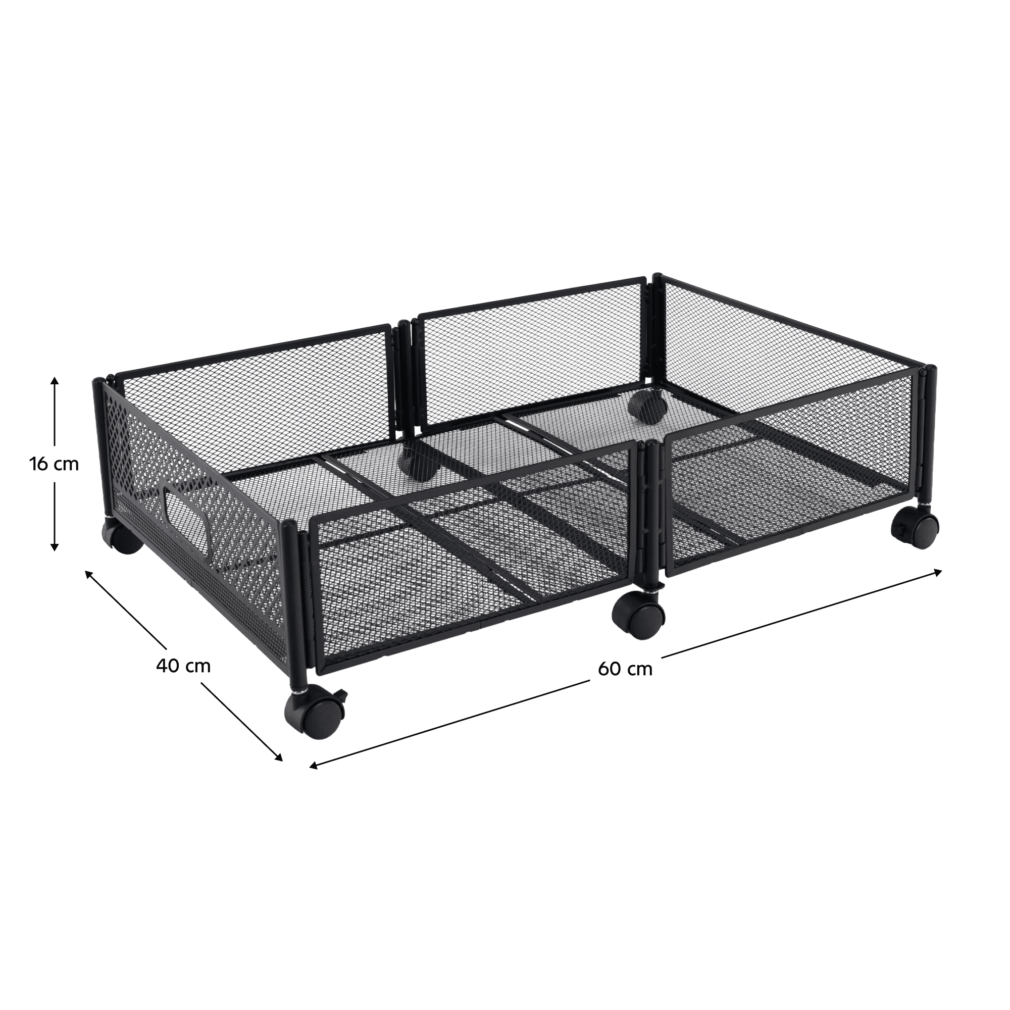 Material: metal Culoare: neagră Dimensiuni (lxAxh): 60x40x16 cm Pliabil Pe roţi Roţi din plastic cu frână Uşor de manevrat Circulaţie sigură a aerului Sub pat Pentru depozitarea hainelor, jucăriilor şi pantofilor Multifuncţional Practic Livrat dezasamblat