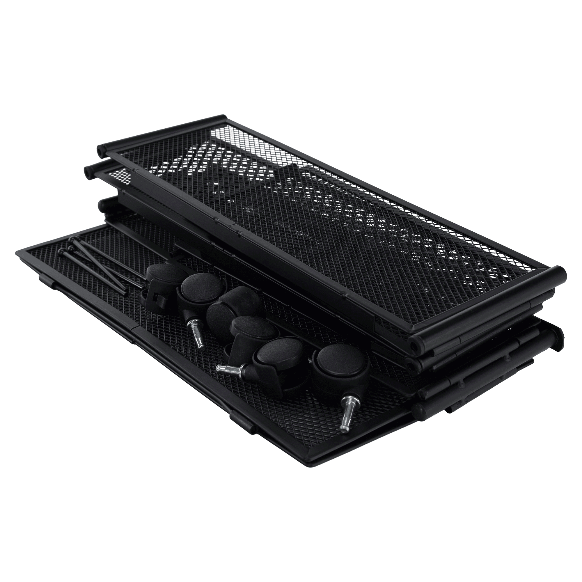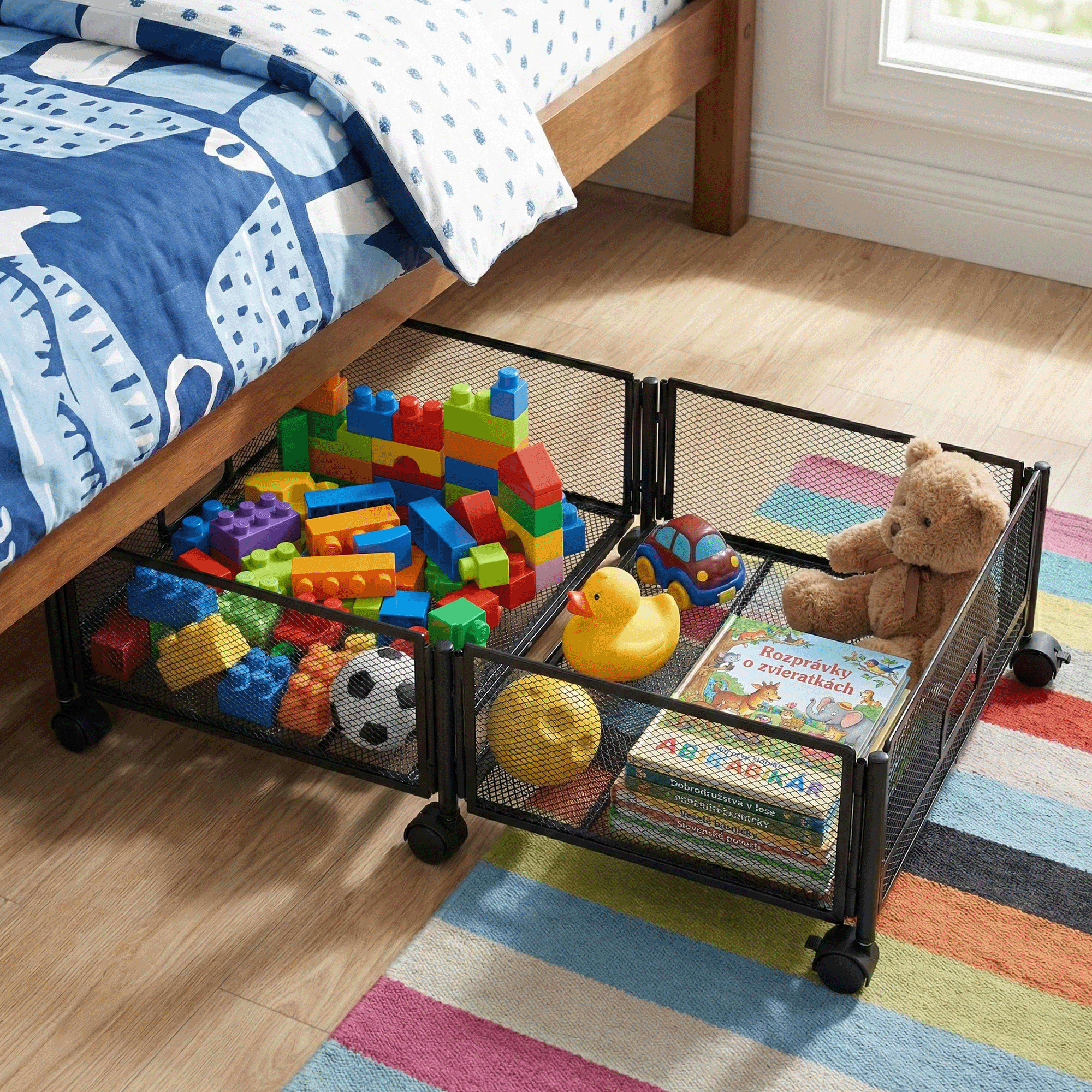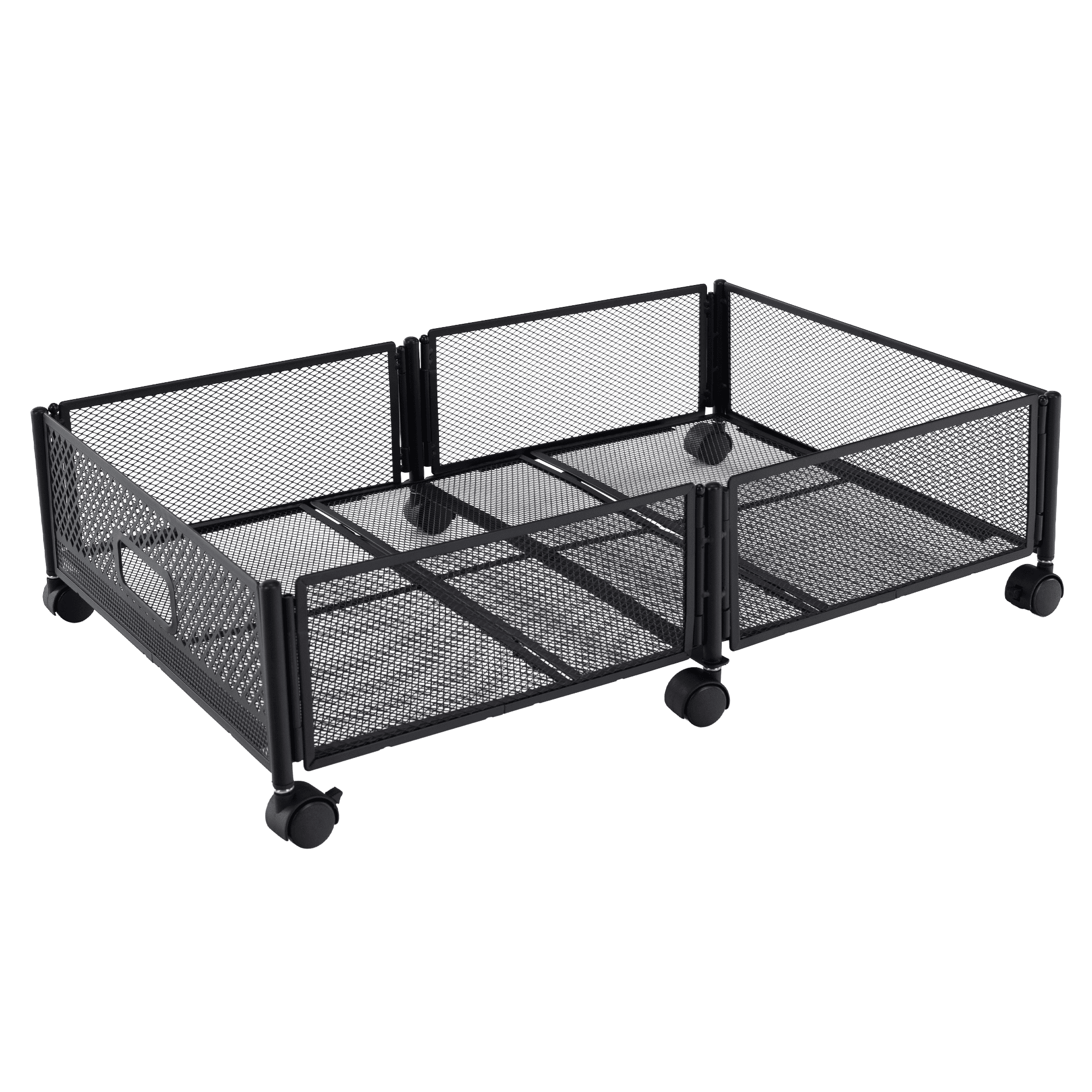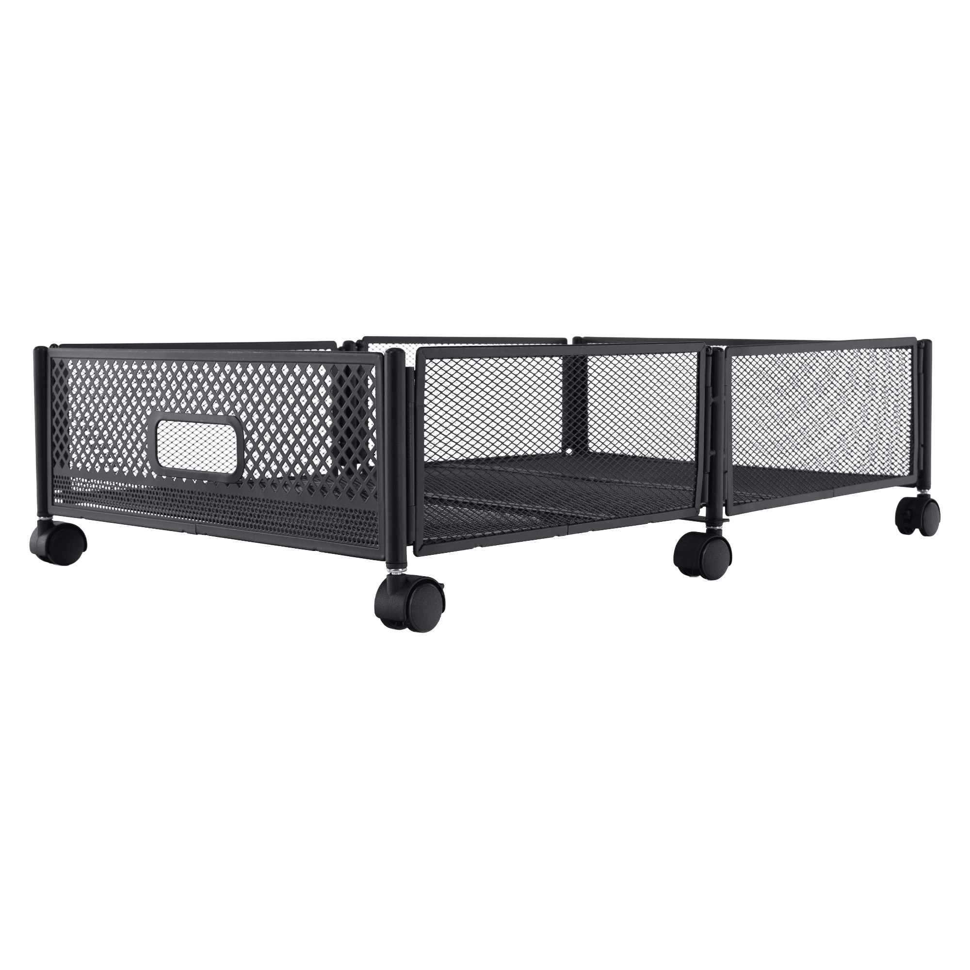Material: metal Culoare: neagră Dimensiuni (lxAxh): 60x40x16 cm Pliabil Pe roţi Roţi din plastic cu frână Uşor de manevrat Circulaţie sigură a aerului Sub pat Pentru depozitarea hainelor, jucăriilor şi pantofilor Multifuncţional Practic Livrat dezasamblat